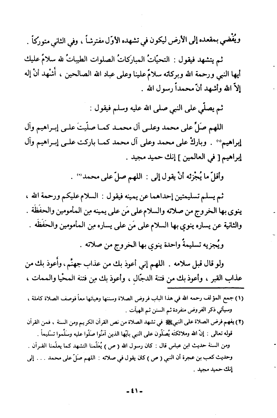 ويفضي بمقعده إِلَى الأَرْض ليَكُون فِي تشهده الأول مفترشا وَفِي الثَّانِي متوركا ثمَّ يتَشَهَّد فَيَقُول التَّحِيَّات المباركات الصَّلَوَات الطَّيِّبَات لله سَلام عَلَيْك أَيهَا النَّبِي وَرَحْمَة الله وَبَرَكَاته سَلام علينا وعَلى عباد الله الصَّالِحين أشهد أَن لَا إِلَه إِلَّا الله وَأشْهد أَن مُحَمَّد رَسُول الله ثمَّ يُصَلِّي على النَّبِي صلى الله عَلَيْهِ وَسلم فَيَقُول اللَّهُمَّ صل على مُحَمَّد وعَلى آل مُحَمَّد كَمَا صليت على إِبْرَاهِيم وَآل إِبْرَاهِيم وَبَارك عبى مُحَمَّد وعل آل مُحَمَّد كَمَا باركت عبى إِبْرَاهِيم وَآل إِبْرَاهِيم (فِي الْعَالمين) إِنَّك حميد مجيد وَأَقل مَا يُجزئهُ أبن يَقُول إِلَى اللَّهُمَّ صل على مُحَمَّد ثمَّ يسلم تسلميتين إِحْدَاهمَا عَن يَمِينه فَيَقُول السَّلَام عَلَيْكُم اورحمة الله ينوى بهَا الْخُرُوج من صلَاته وَالسَّلَام على من على يَمِينه من الْمَأْمُومين والحفظة ويجزيه تَسْلِيمَة وَاحِدَة يَنْوِي بهَا الْخُرُوج من صلَاته وَلَو قَالَ قبل سَلَامه اللَّهُمَّ إِنِّي أعوذ بك من عَذَاب جَهَنَّم وَأَعُوذ بك من عَذَاب الْقَبْر وَأَعُوذ بك من فتْنَة الدَّجَّال وَأَعُوذ بك من فتْنَة الْمحيا وَالْمَمَات