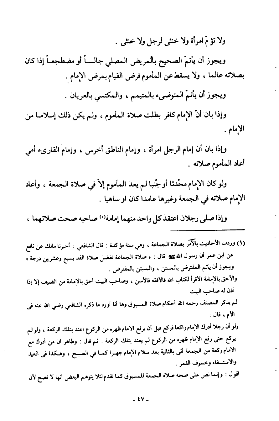 وَلَا تؤم امْرَأَة وَلَا خُنْثَى لرجل وَلَا خُنْثَى وَيجوز أَن يأتم الصَّحِيح بالمريض الْمُصَلِّي جَالِسا أَو مُضْطَجعا إِذا كَانَ بِصَلَاتِهِ عَالما وَلَا يسْقط عَن الْمَأْمُوم فرض الْقيام بِمَرَض الإِمَام وَيجوز أَن يأتم المتوضىء بالمتييم والمكتسي بالعريان وَإِذا بَان أَن الإِمَام كَافِر بطلت صَلَاة الْمَأْمُوم وَلم يكن ذَلِك إسلاما من الإِمَام وَإِذا بَان أَن إِمَام الرجل امْرَأَة وَإِمَام النَّاطِق أخرس وَإِمَام القارىء أُمِّي أعَاد لالمأموم صلَاته وَلَو كَانَ الْأَمَام مُحدثا أَو جنبا لم يعد الْمَأْمُوم إِلَّا فِي صَلَاة الْجُمُعَة وَأعَاد الإِمَام صلَاته فِي الْجُمُعَة وَغَيرهَا عَامِدًا كلن أَو سَاهِيا وَإِذا صلى رجلَانِ اعْتقد كل وَاحِد مِنْهُمَا إِمَامَة صَاحبه صحت صلاتهما