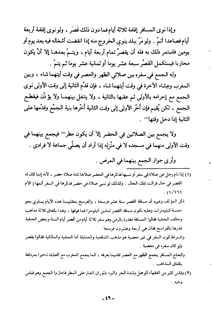 وَإِذا نوى الْمُسَافِر إِقَامَة ثَلَاثَة أَيَّام فَمَا دون ذَلِك قصر وَلَو نوى إِقَامَة أَرْبَعَة أَيَّام فَصَاعِدا أتم وَلَو مر بِبَلَد يَنْوِي الْخُرُوج مِنْهُ إِذا انْقَضتْ أشغاله فِيهِ بعد يَوْم أَو يَوْمَيْنِ فاستمر ذَلِك بِهِ فَلهُ أَن يقصر تَمام أَرْبَعَة أَيَّام وَيتم بعْدهَا إِلَّا أَن يكون مُحَاربًا فيستكمل الْقصر سَبْعَة عشر يَوْمًا أَو ثَمَانِيَة عشر يَوْمًا ثمَّ يتم وَله الْجمع فِي سَفَره بَين صَلَاتي الظّهْر وَالْعصر فِي وَقت أَيَّتهمَا شَاءَ وَبَين الْمغرب وعشاء الْآخِرَة فِي وَقت أَيَّتهمَا شَاءَ فَإِن قدم الثَّانِيَة إِلَى وَقت الأولى نوى الْجمع مَعَ إِحْرَامه بِالْأولَى ثمَّ عَقبهَا بِالثَّانِيَةِ وَلَا يتَنَفَّل بَينهمَا وَلَا يُؤذن فَيقطع الْجمع لَكِن يُقيم فَإِن أخر الأولى إِلَى وَقت الثَّانِيَة أَخّرهَا بنية الْجمع وقدمها على الثَّانِيَة إِذا دخل وَقتهَا وَلَا يجمع بَين الصَّلَاتَيْنِ فِي الْحَضَر إِلَّا أَن يكون مطر فَيجمع بَينهمَا فِي وَقت الأولى منما فِي مَسْجده لَا فِي منزله إِذا أَرَادَ أَن يُصَلِّي جمَاعَة لَا فُرَادَى وَأرى جَوَاز الْجمع بَينهمَا فِي الْمَرَض
