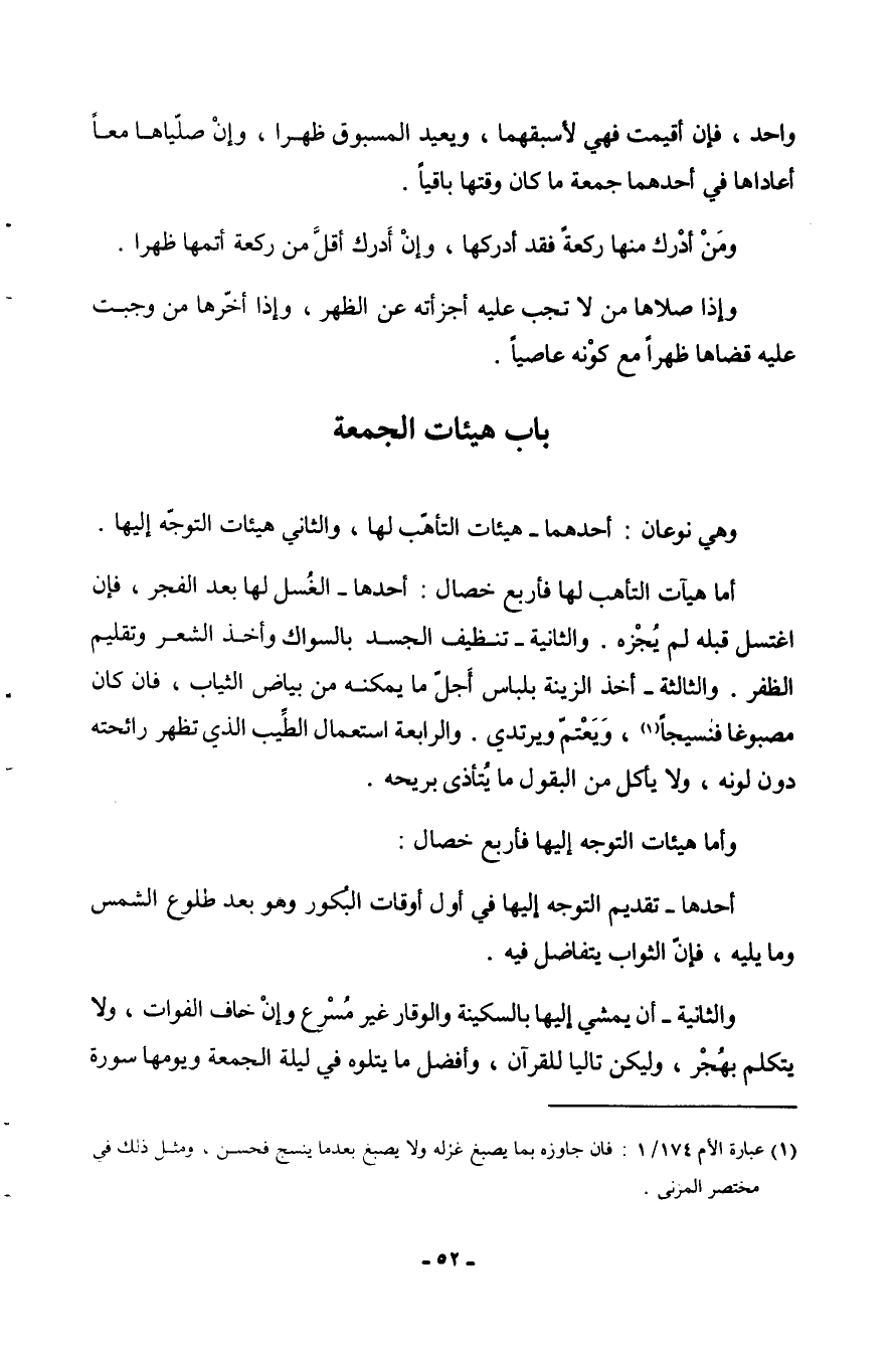 بَاب هيئات الْجُمُعَة وَهِي نَوْعَانِ أَحدهمَا هيئات التأهب لَهَا وَالثَّانِي هيئات التَّوَجُّه إِلَيْهَا أما هيآت التأهب لَهَا فأربع خِصَال أَحدهَا الْغسْل لَهَا بعد الْفجْر فَإِن اغْتسل قبله لم يجزه وَالثَّانيَِة تنظيف الْجَسَد بلاسواك وَأخذ الشّعْر وتقليم الظفر وَالثَّالِثَة أَخذ الزِّينَة بلباس أجل مَا يُمكنهُ من بَيَاض الثِّيَاب فان كَانَ مصبوغا فنسيجا ويعتم ويرتدي وَالرَّابِعَة اسْتِعْمَال الطّيب الَّذِي تظهر رَائِحَته دون لَونه وَلَا يَأْكُل من الْبُقُول مَا يتَأَذَّى بريحه وَأما هيئات التَّوَجُّه إِلَيْهَا فأربع خِصَال أَحدهَا تَقْدِيم التَّوَجُّه إِلَيْهَا فِي أول أَوْقَات البكور وَهُوَ بعد طُلُوع الشَّمْس وَمَا يَلِيهِ فَإِن الثَّوَاب يتفاضل فِيهِ وَالثَّانيَِة أَن يمشؤ إِلَيْهَا بِالسَّكِينَةِ وَالْوَقار غير مسرع وَإِن خَافَ الْفَوات وَلَا يتَكَلَّم بهجر وَليكن تاليا لِلْقُرْآنِ وَأفضل مَا يتلوه فِي لَيْلَة الْجُمُعَة ويومها سُورَة