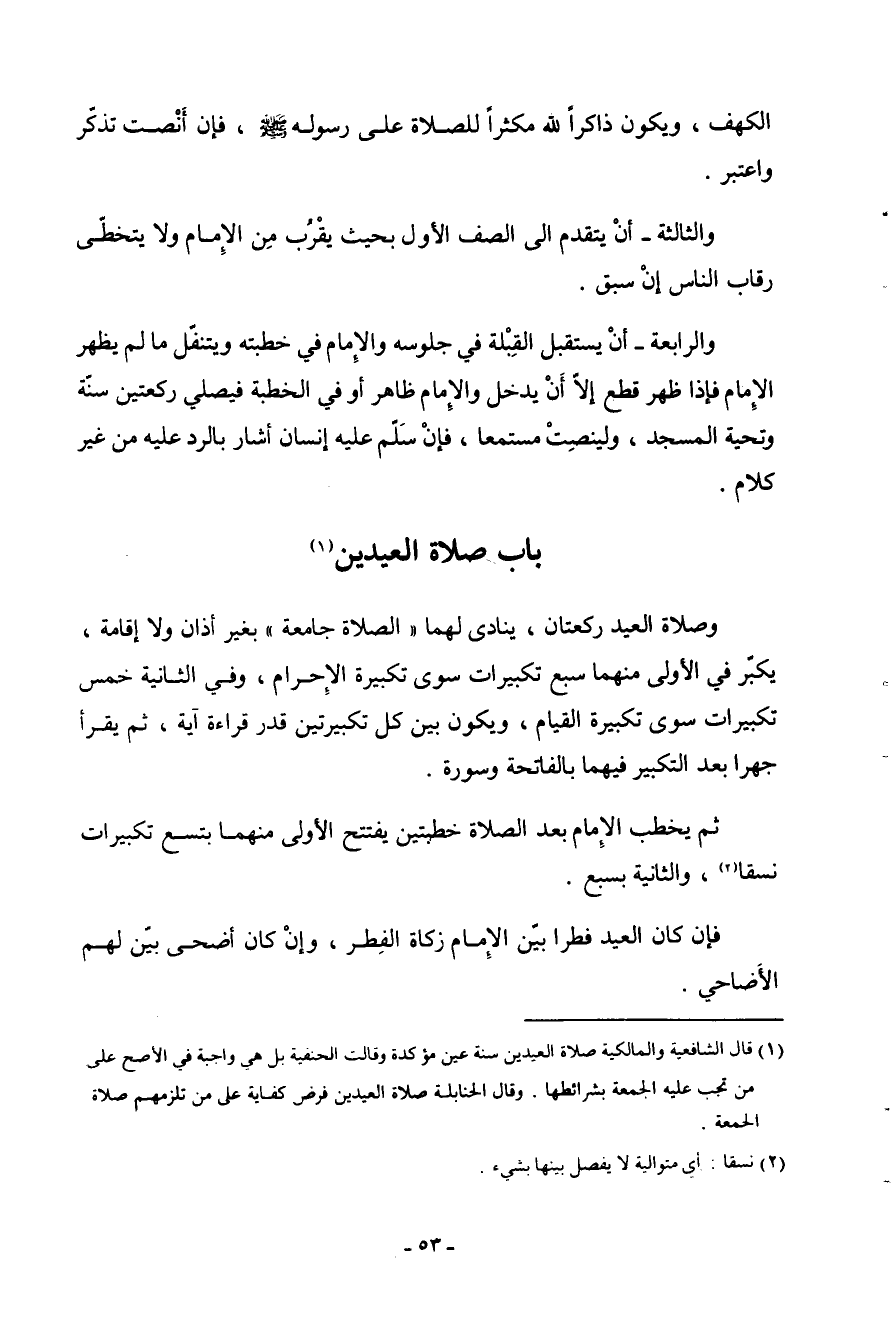 الْكَهْف وَيكون ذَاكِرًا لله مكثرا للصَّلَاة على صلى الله عَلَيْهِ وَسلم فَإِن أنصت تذكر وَاعْتبر وَالثَّالِثَة أَن يتَقَدَّم إِلَى الصَّفّ الأول بِحَيْثُ يقرب من الإِمَام وَلَا يتخطى رِقَاب النَّاس إِن سبق وَالرَّابِعَة أَن يسْتَقْبل الْقبْلَة فِي جُلُوسه وَالْإِمَام فِي خطبَته ويتنفل مَا لم يظْهر الإِمَام فَإِذا ظهر قطع إِلَّا أَن يدْخل وَالْإِمَام ظَاهر أَبُو فِي الْخطْبَة فيصلبي رَكْعَتَيْنِ سنة وتحية الْمَسْجِد ولينصت مستمعا فَإِن سلم عَلَيْهِ إِنْسَان أَشَارَ بِالرَّدِّ عَلَيْهِ من غير كَلَام