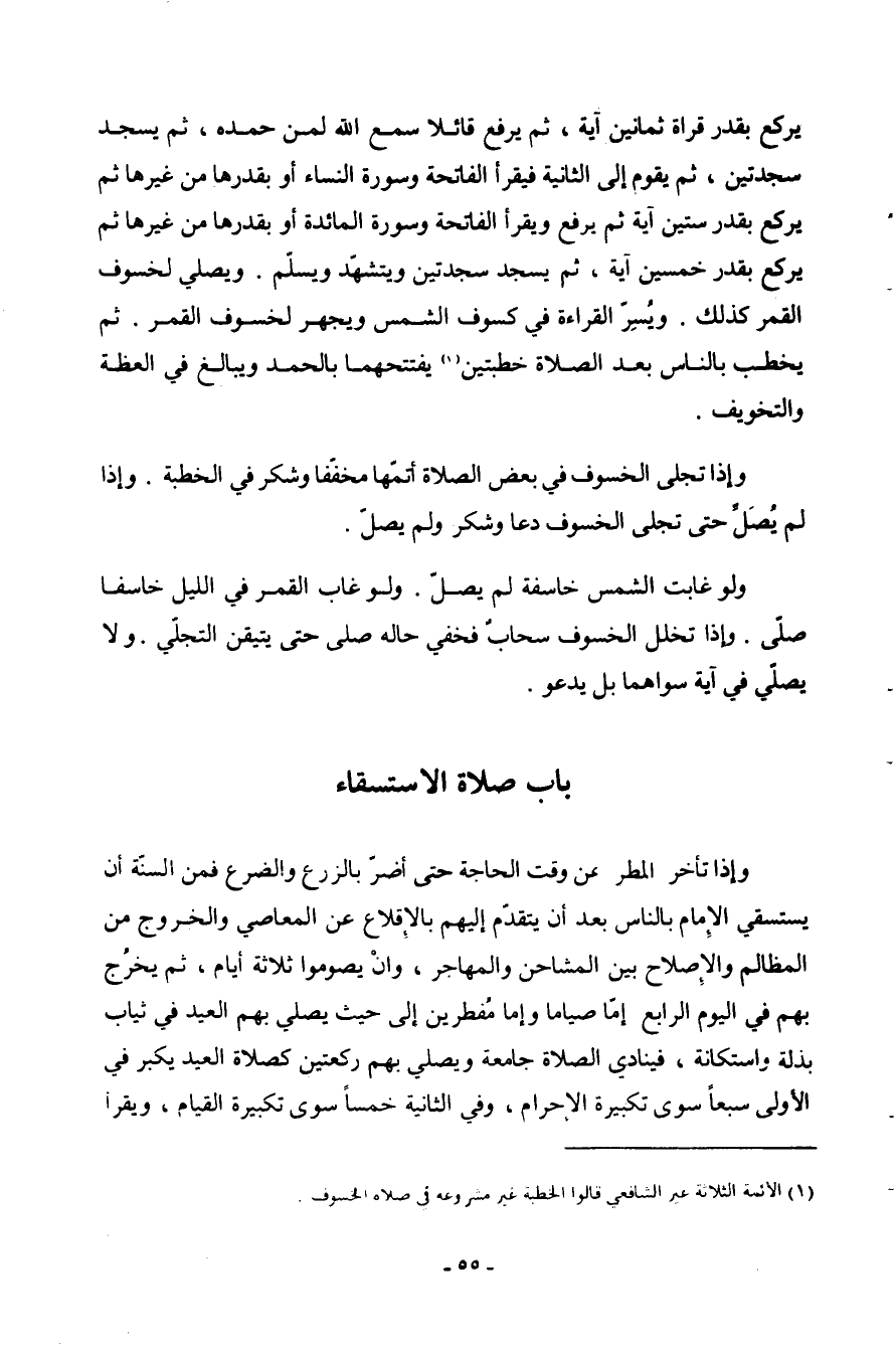 يرْكَع بِقدر قِرَاءَة ثَمَانِينَ آيَة ثمَّ يرفع قَائِلا سمع اللع لمن حَمده ثمَّ يسْجد سَجْدَتَيْنِ ثو يقوم إِلَى الثَّانِيَة فَيقْرَأ الْفَاتِحَة وَسورَة النِّسَاء أَو بِقَدرِهَا من غَيرهَا ثمَّ يرْكَع بِقدر سِتِّينَ آيَة ثمَّ يرفع وَيقْرَأ الْفَاتِحَة وَسورَة الْمَائِدَة أَو بِقَدرِهَا من غَيرهَا ثمَّ يرْكَع بِقدر خمسين آيَة ثمَّ يسْجد سَجْدَتَيْنِ ويتشهد وَيسلم وَيُصلي لخسوف الْقَمَر ثمَّ يخْطب بِالنَّاسِ بعد الصَّلَاة خطبتين يفتتحهما بِالْحَمْد ويبالغ فِي العظة والتخويف وَإِذا تجلى الخسوف فِي بعض الصَّلَاة أتمهَا مخففا وشكر فِي الْخطْبَة وَإِذا لم يصل حَتَّى تجلى الخسوف عا وشكر وَلم يصل وَلَو غَابَتْ الشَّمْس خاسفة لم يصل وَلَو غَابَ الْقَمَر فِي اللَّيْل خاسفا صلى وَإِذا تخَلّل الخسوف سَحَاب فخفي حَاله صلى حَتَّى يتَيَقَّن التجلي وَلَا يُصَلِّي فِي آيَة سواهُمَا بل يَدْعُو