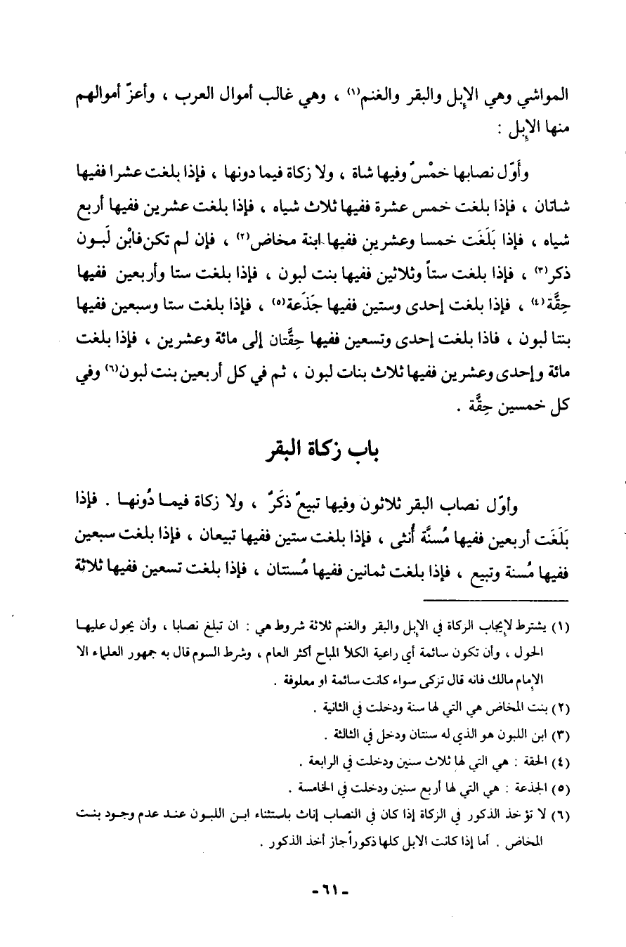 الْمَوَاشِي وَهِي الْإِبِل وَالْبَقر وَالْغنم وَهِي غَالب أَمْوَال الْعَرَب وأعز أَمْوَالهم مِنْهَا الْإِبِل وَأول نصابها خمس وفيهَا شَاة وَلَا زَكَاة فِيمَا دونهَا فَإِذا بلغت عشْرين فَفِيهَا أَربع شِيَاه فَإِذا بلغت خمْسا وَعشْرين فَفِيهَا ابْنة مَخَاض فَإِن لم تكن فَابْن لبون ذكر فَإِذا بلغت سِتا وَثَلَاثِينَ فَفِيهَا بنت لبون فَإِذا بلغت ستتا وَأَرْبَعين فَفِيهَا حقة فَإِذا بلغت إِحْدَى وَسِتِّينَ فَفِيهَا جَذَعَة فَإِذا بلغت سِتا وَسبعين فَفِيهَا بنت لبون فَإِذا بلغت إِحْدَى وَتِسْعين فَفِيهَا حقتان إِلَى مائَة وَعشْرين فَإِذا بلغت مائَة وَإِحْدَى وَعشْرين فَفِيهَا ثَلَاث بَنَات لبون وَفِي كل خمسين حقة