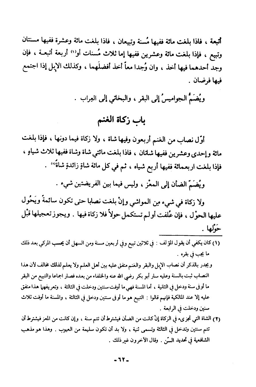 بَاب زَكَاة الْغنم أول نِصَاب من الْغنم أَرْبَعُونَ وفيهَا شَاة وَلَا زَكَاة فِيمَا ندونها فَإِذا بلغت مائَة وَإِحْدَى وَعشْرين يففيها شلتان فَإِذا بلغت مائتيشاة وشَاة فَفِيهَا ثَلَاث شِيَاه فَإِذا بلغت أَرْبَعمِائَة فِيهَا أَربع شِيَاه ثمَّ فِي كل مائَة شَاة زَائِدَة شَاة وَيضم الضَّأْن إِلَى الْمعز وَلَيْسَ فِيمَا بَين الفريضتين شَيْء وَلَا زَكَاة فِي شَيْء من الْمَوَاشِي وَإِن بلغت نِصَابا حَتَّى تكون سَائِمَة ويحول عَلَيْهَا الْحول فَإِن علفت أَو لم تستكمل حولا فَلَا زَكَاة فِيهَا وَيجوز تَعْجِيلهَا قبل حولهَا
