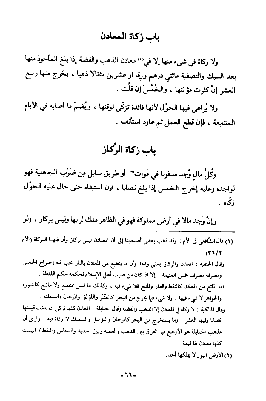 بَاب زَكَاة الْمَعَادِن وَلَا زَكَاة فِي شَيْء مِنْهَا إِلَّا فِي معادن الذَّهَب وَالْفِضَّة إِذا بلغ الْمَأْخُوذ مِنْهَا بعد السبك والتصفية مِائَتي دِرْهَم وَرقا أَو عشْرين مِثْقَالا ذَهَبا ريخرج مِنْهَا ربع الْعشْر إِن كثرت مؤنتها وَالْخمس إِن قلت وَلَا يُرَاعى فِيهَا الْحول لِأَنَّهَا فَائِدَة تزكّى لوَقْتهَا وَيضم مَا أَصَابَهُ فِي الْأَيَّام المتتابعة فَإِن قطع الْعَمَل ثمَّ عاود اسْتَأْنف