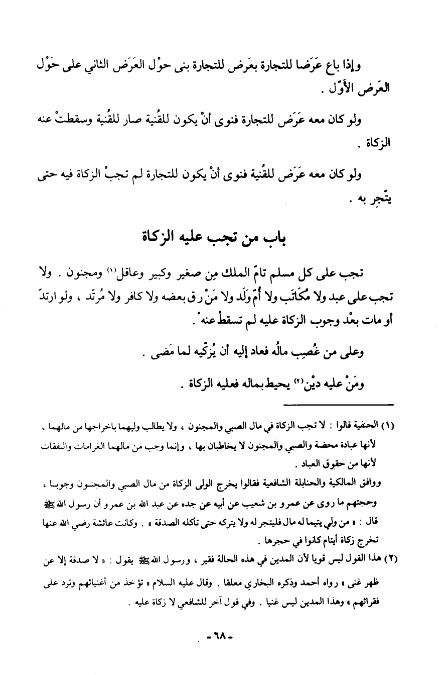 بَاب من تجب عَلَيْهِ الزَّكَاة تجب عبى كل مُسلم تَامّ الْملك من صَغِير وكبير وعاقل وَمَجْنُون وَلَا تجب عبى عبد وَلَا مكَاتب وَلَا أم ولد وَلَا ون رق بعضه وَلَا كَافِر وَلَا مُرْتَد وَلَا ارْتَدَّ أَو مَاتَ بعد وجوب الزَّكَاة عَلَيْهِ لم تسْقط عَنهُ وعَلى من غصب مَاله فَعَاد إِلَيْهِ أَن يُزَكِّيه لما مضى وَمن عَلَيْهِ دين يُحِيط بِمَالِه فَعَلَيهِ الزَّكَاة