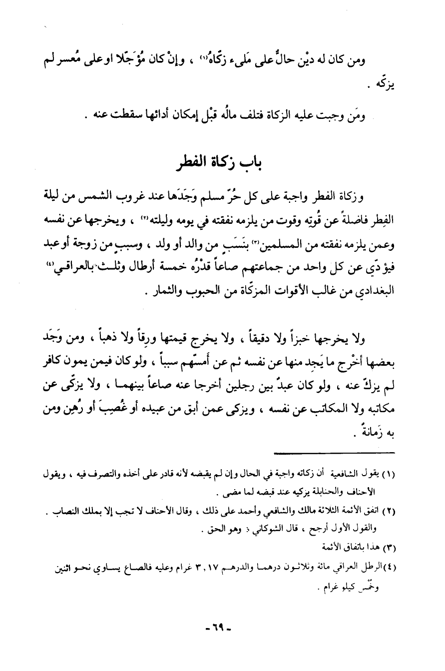 بَاب زَكَاة الْفطر وَزَكَاة الْفطر وَاجِبَة عبى كل حر مُسلم زجدها عِنْد غرُوب الشَّمْس من لَيْلَة الْفطر فالة عَن قوته وقوت من يلْزمه نَفَقَته فِي يَوْمه وَلَيْلَته ويخرجها عَنهُ نَفسه وَعَمن يلْزمه نَفَقَته من امسلمين وبنسب من وَالِد أَو ولد وَسبب من زَوْجَة أَو عبد فَيُؤَدِّي عَن كل وَاحِد من جَمَاعَتهمْ صَاعا قدره خَمْسَة أَرْطَال وَثلث بالعراقي الْبَغْدَادِيّ من غَالب الأقوات المزكاة من الْحُبُوب وَالثِّمَار وَلَا يُخرجهَا خبْزًا وَلَا دَقِيقًا وَلَا يخرج قيمتهَا وَرقا وَلَا ذَهَبا وَمن وجد بَعْضهَا أخرج مَا يجد مِنْهَا عَن نَفسه ثمَّ عَن أمسهم سَببا وَلَو كَانَ فِيمَن يمون كَافِر لم يزك عَنهُ وَلَو كتَّان عبد بَين رجلَيْنِ أخرجَا عَنهُ صاا بَينهمَا وَلَا يزكّى عَن مكَاتبه وَلَا الْمكَاتب عَن نَفسه ويزكى عَمَّن أبق عُبَيْدَة أَو غصب أَو رهن وَمن بِهِ زمانة