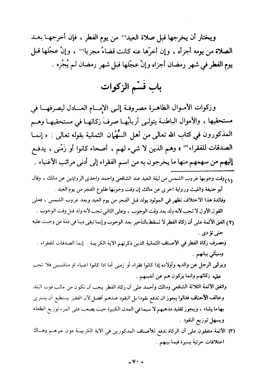 بَاب قسم الزكواتن وزكوات الْأَمْوَال الظَّاهِرَة مصروفة إِلَى الإمانم الْعَادِل ليصرفها فِي مستحقيها وَالْأَمْوَال الْبَاطِنَة يتَوَلَّى أَرْبَابهَا صرف زَكَاتهَا فِي مستحقيها وهم المذكورون فِي كتاب الله تَعَالَى من أهل السهْمَان الثَّمَانِية بقوله تَعَالَى {إِنَّمَا الصَّدقَات للْفُقَرَاء} ووالذين لَا شَيْء لهمظظظ أصحاء كَانُوا أَو زمنى يدْفع إِلَيْهِم من سهمهم مِنْهَا مَا يخرجُون بِهِ من اسْم الْفُقَرَاء إِلَى أدنى مَرَاتِب الْأَغْنِيَاء