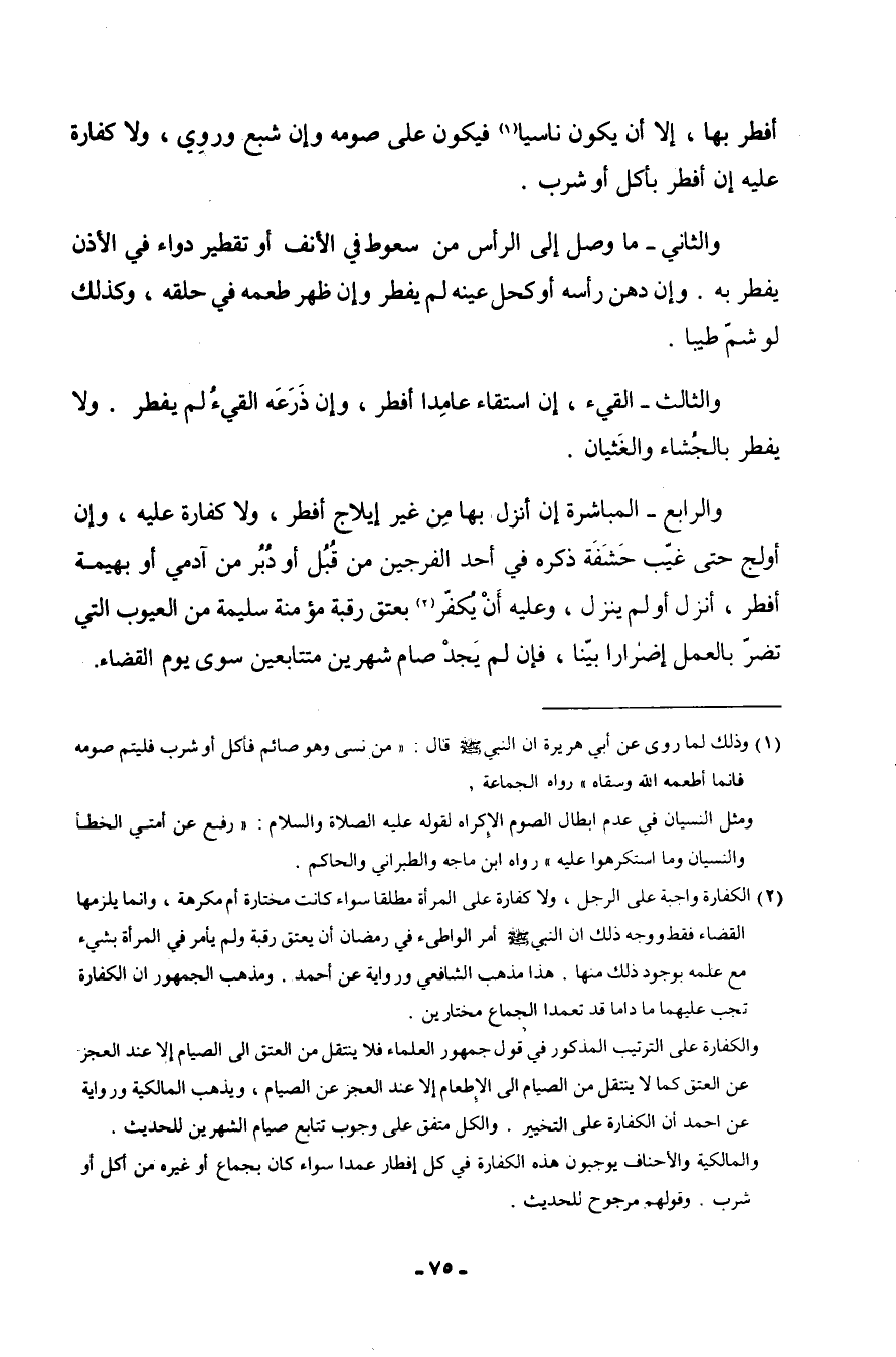 أفطر بهَا إِلَّا أَن يكون نَاسِيا فَيكون على صَوْمه وَإِن شبع ورزي وَلَا كَفَّارَة عَلَيْهِ إِن أفطر بِأَكْل أَو شرب وَالثَّانِي مَا وصل إِلَى الرَّأْس من سعوط فِي النف أَو تقطير دَوَاء فِي الْأذن يفْطر بِهِ وَإِن دهن رَأسه أَو كحل عينه لم يفْطر وَإِن ظهر طعمه فِي حلقه وَكَذَلِكَ لَو شم طيبا وَالثَّالِث الْقَيْء إِن استقاء عَامِدًا أفطر وَإِن ذرعه الْقَيْء لم يفْطر وَلَا يفْطر بالجشاء والغثيان وَالرَّابِع الْمُبَاشرَة إِن إنزل بهَا من غير إيلاج أفطر وَلَا كَفَّارَة عَلَيْهِ وَإِن أولج حَتَّى حَتَّى غيب حَشَفَة ذكره فِي أحد الفرجين من قبل أَو دبر من آدَمِيّ أَو بَهِيمَة أفطر أنزل أَو لم ينزل وَعَلِيهِ أَن يكفر بِعِتْق رَقَبَة مُؤمنَة سليمَة من الْعُيُوب الَّتِي تضر بِالْعَمَلِ إِضْرَارًا بَينا فَإِن لم يجد صَامَ شَهْرَيْن مُتَتَابعين سوى يَوْم الْقَضَاء