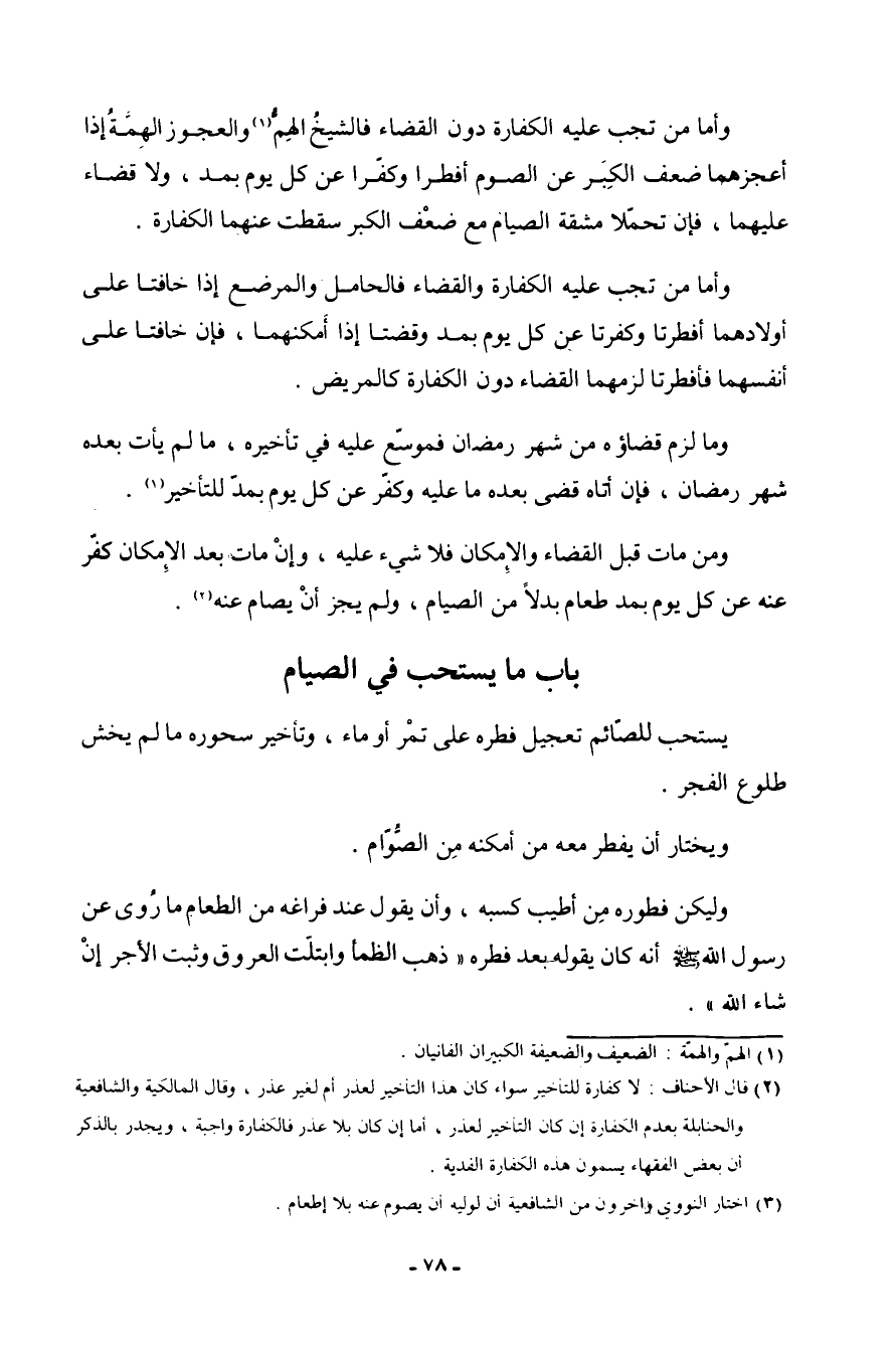 وَأما من تجب عَلَيْهِ الْكَفَّارَة دون الْقَضَاء فالشيخ الْهم والعجوز الهمة إِذا أعجزهما ضعف الْكبر عَن الصَّوْم أفطرا وَكفرا عَن كل يَوْم بِمد وَلَا قَضَاء عَلَيْهِمَا فَإِن تحملا مشقة الصّيام مَعَ ضعف الْكبر سَقَطت عنما الْكَفَّارَة وَأما من تجب عَلَيْهِ الْكَفَّارَة وَالْقَضَاء فالحامل والمرضع إِذا خحافتا على أولادهما أفطرتا وكفرتا عَن كل يَوْم بِمد وقضتا إِذا أمكنهما فَإِن خافتا على أَنفسهمَا فأفطرتا لزمهما الْقَضَاء دون الْكَفَّارَة كَالْمَرِيضِ وَمَا لزم قَضَاؤُهُ من شهر رَمَضَان فموسع عَلَيْهِ فِي تَأْخِيره مَا لم يَأْتِ بعده شهر رَمَضَان فَإِن أَتَاهُ قضى بعده مَا عَلَيْهِ وَكفر عَن كل يَوْم بِمد للتأخير وَمن مَاتَ قبل الْقَضَاء والإمكان فَلَا شَيْء عَلَيْهِ وَإِن مَاتَ بعد الأمكان كفر عَنهُ عَن كل يَوْم بِمد طَعَام بَدَلا من الصّيام وَلم يجز أَن يصام