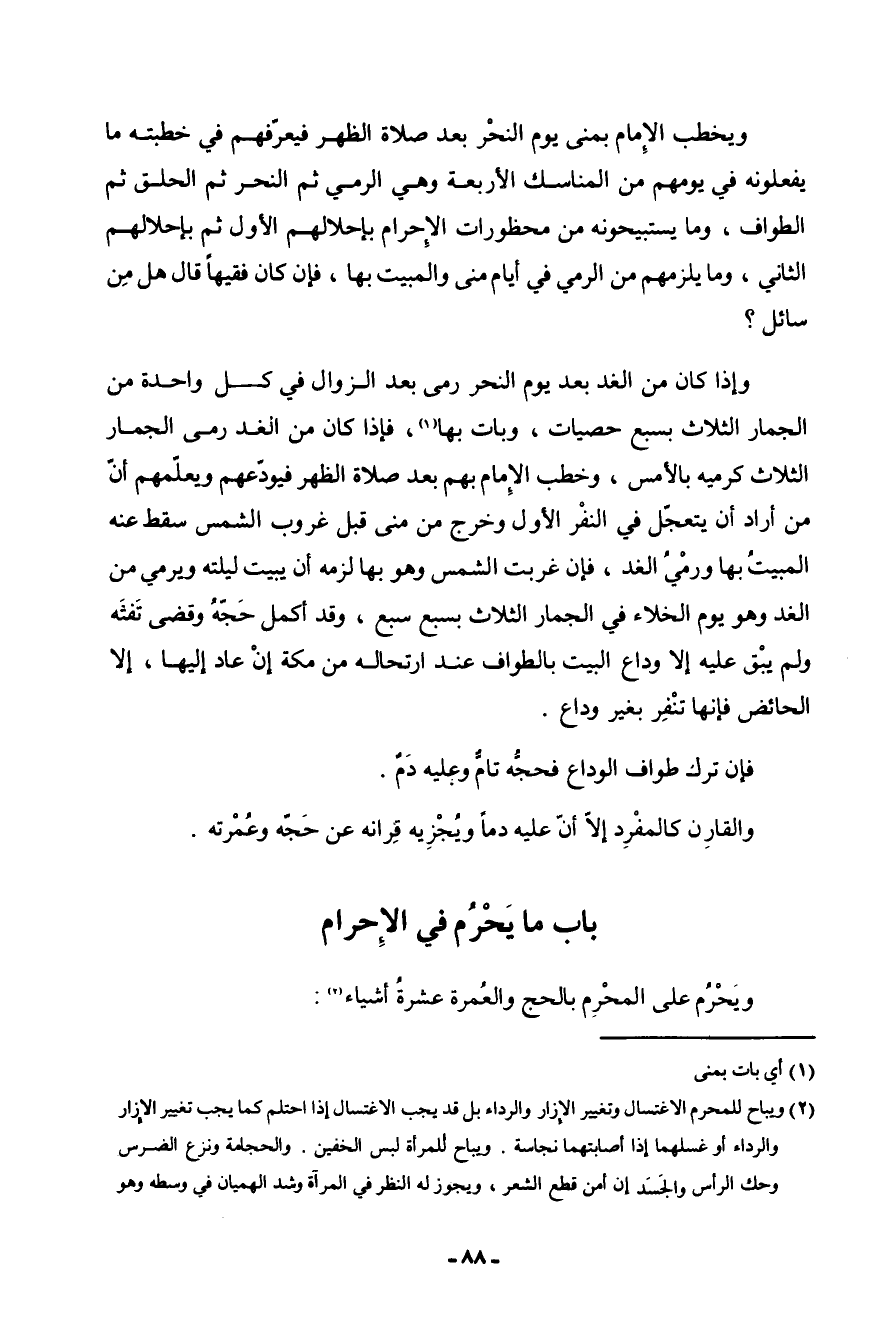 فَإِن كَانَ فَقِيها قَالَ هلل من سَائل وَإِذا كَانَ من الْغَد بعدج يَوْم النمحر رمى بعد الزَّوَال فِي كل وَاحِدَة من الْجمار الثَّلَاث بِسبع حَصَيَات وَبَات بهَا فَإِذا كَانَ من الْغَد رمى الْجمار الثَّلَاث كرميه بالْأَمْس وخطب الإِمَام بهم بعد صَلَاة الظّهْر فيودعهم وَيُعلمهُم أَن من أَرَادَ أَن يتعجل فِي النَّفر الأول وَخرج من منى قبل غرُوب الشَّمْس سقط عَنهُ الْمبيت بهَا وَرمي الْغَد فَإِن غربت الشَّمْس وَهُوَ بهَا لزمَه أَن يبيت ليلته وَيَرْمِي من الْغَد وَهُوَ يَوْم الْخَلَاء فِي الْجمار الثَّلَاث بِسبع سبع وَقد أكمل حجه وَقضى تفثه وَلم يبْق عَلَيْهِ إِلَّا وداع الْبَيْت بِالطّوافِ عمد ارتحاله من مَكَّة إِن عَاد إِلَيْهَا إِلَّا الْحَائِض فَإِنَّهَا تنفر بِغَيْر وداع فَإِن ترك طواف الْوَدَاع فحجه تَامّ وَعَلِيهِ دم والقارن كالمفرد إِلَّا أَن عَلَيْهِ دَمًا ويجزيه قرانه عَن حجه وعمرته