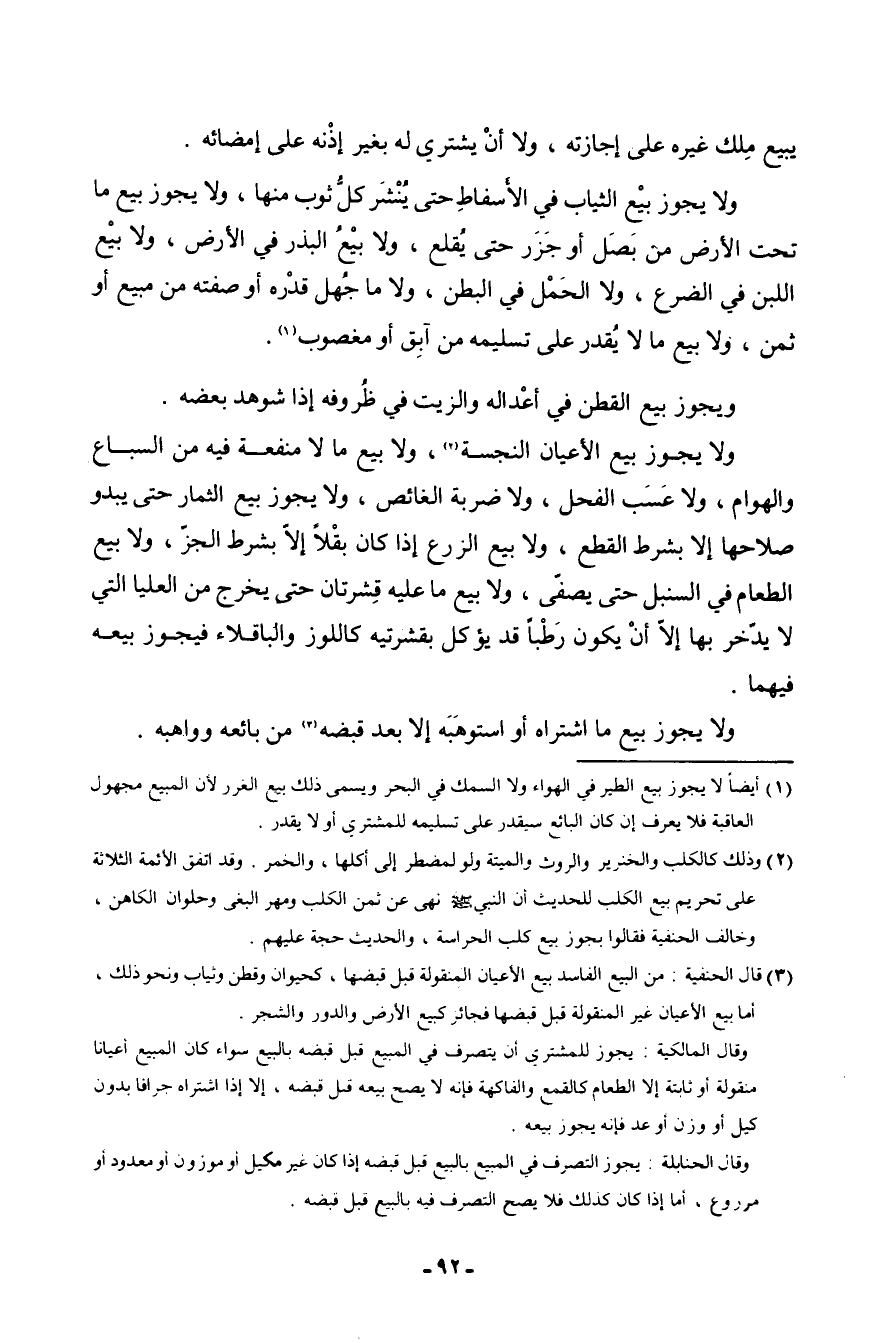 يَبِيع ملك غَيره على إِجَازَته وَلَا أَن يَشْتَرِي لَهُ بِغَيْر إِذْنه على إمضائه وَلَا يجوز بيع الثِّيَاب فِي الأسفاط حَتَّى ينشر كل ثوب مِنْهَا وَلَا يجوز بيع مَا تَحت الأَرْض من بصل أَو جزر حَتَّى يلع وَلَا بيع الْبذر فِي الأَرْض وَلَا بيع اللَّبن فِي الضَّرع وَلَا الْحمل فِي الْبَطن وَلَا مَا جهل قدره أَو صفته من مَبِيع أَو ثمن وَلَا بيع مَا لَا يقدر على تَسْلِيمه من آبق أَو مَغْصُوب وَيجوز بيع الْقطن فِي أهداله وَالزَّيْت فِي ظروفه إِذا شوهد بعضه وَلَا يجوز بيع الْأَعْيَان النَّجِسَة وَلَا بيع مَا لَا مَنْفَعَة فِيهِ من السبَاع والهوام وَلَا عسب الْفَحْل وَلَا ضَرْبَة الغائص وَلَا يجوز بيع التمار حَتَّى يَبْدُو صَلَاحهَا إِلَّا بِشَرْط الْقطع وَلَا بيع الزَّرْع إِذا كَانَ بقلا إِلَّا بِشَرْط الجز وَلَا بيع الطَّعَام فِي السنبل حَتَّى يصفى وَلَا بيع مَا عَلَيْهِ قشرتان حَتَّى يخرج من الْعليا الَّتِي لَا يدّخر بهَا إِلَّا أَن يكون رطبا قد يُؤْكَل بقشرتيه كاللوز والباقلاء فَيجوز بَيْعه فيهمَا وَلَا يجوز بيع مَا اشْتَرَاهُ أَو استوهبه إِلَّا بعد قَبضه من بَائِعه وواعبه