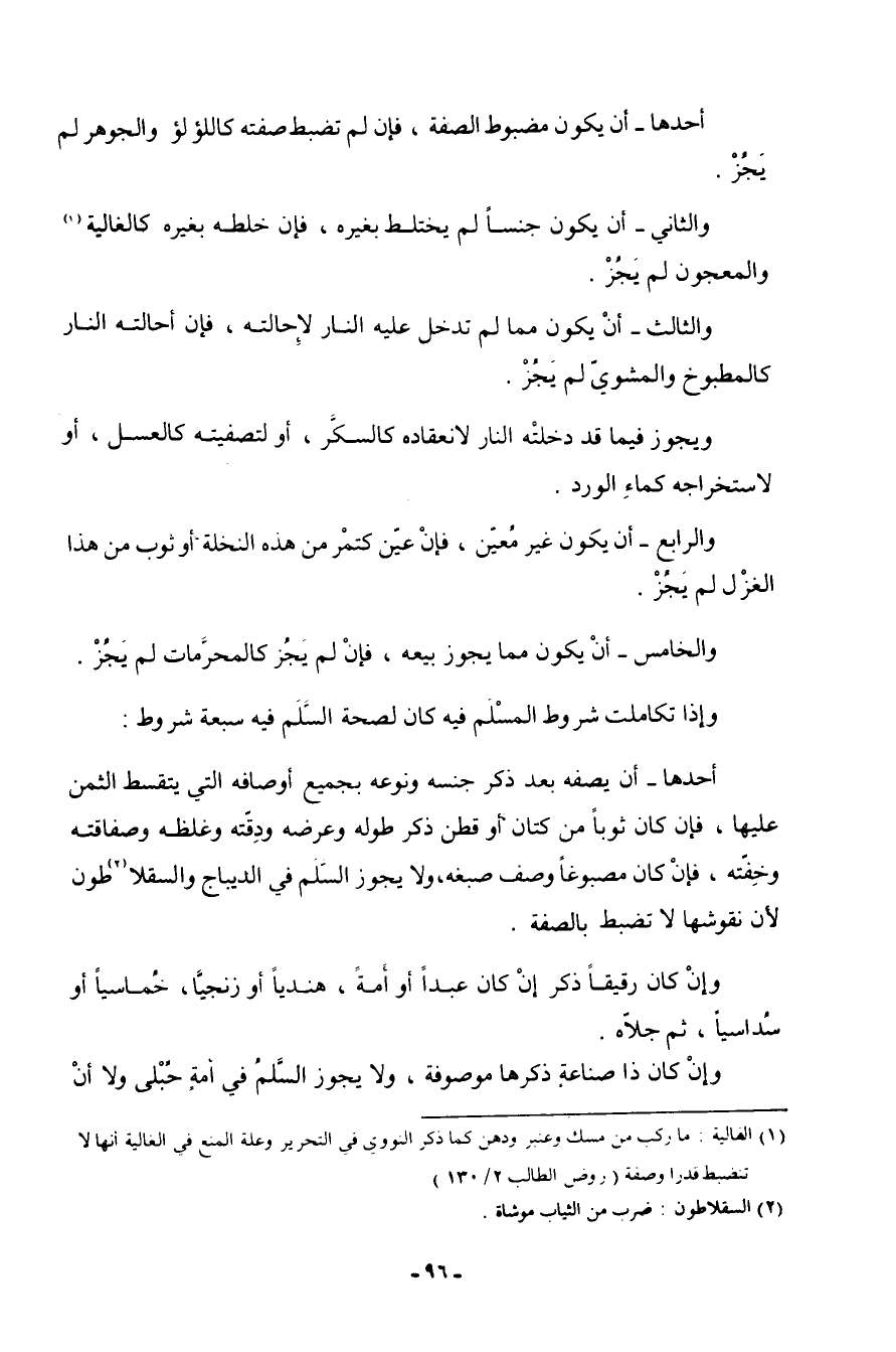 لأحدها أَن يكون مضبوط الصّفة فَإِن لم تضبط صفته كَاللُّؤْلُؤِ والجوهر لم يجز وَالثَّانِي أَن يكون جِنْسا لم يخْتَلط بِغَيْرِهِ فَإِن خلطه بِغَيْرِهِ كالغالية والمعجون لم يجز وَالثَّالِث أَن يكون مِمَّا لم تدخل عَلَيْهِ النَّار لإحالته فَإِن أحالته النَّار كالمطبوخ والمشوي لم يجز وَيجوز فِيمَا دَخلته النَّار لانعقاده كالسكر أَو لتصفيته كالعسل أَو لاستخراجه كَمَاء الْورْد وَالرَّابِع أَن يكون غير معِين فَإِن عين كتمر من هَذِه النَّخْلَة أَو ثوب من هَذَا الْغَزل لم يجز وَالْخَامِس أَن يكون مِمَّا يجوز بَيْعه فَإِن لميجز كالمحرمات لم يجز وَإِذا تكاملت شُرُوط الْمُسلم فِيهِ كَانَ لصِحَّة السلمة فِيهِ سَبْعَة شُرُوط أَحدهَا أَن يصفه بعد ذكر جنسه ونوعه بِجَمِيعِ أَوْصَافه الَّتِي يتسقط الثّمن عَلَيْهَا فَإِن كَانَ ثوبا من كتَّان أَو قطن ذكر طوله وَعرضه ودقته وغلظه وصفاقته وَخِفته فَإِن كَانَ مصبوغا وصف صبغه وَلَا يجوز السّلم فِي الديباج والسقلا طون لِأَن نقوشها لَا تضبط بِالصّفةِ وَإِن كَانَ رَقِيقا ذكر إِن كَانَ عبداأو أمة هنديا أَو زنجيا خماسيا أَو سداسيا ثمَّ جلاه وَإِن كَانَ اصناعة ذكرهَا مَوْصُوفَة وَلَا يجوز السّلم فِي أمة حُبْلَى وَلَا أَن