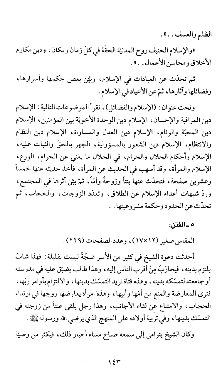 الإسلام والمراة، وقد اسهب في الحديث عن المرأة، فأخذ حديثه عنها خمساً