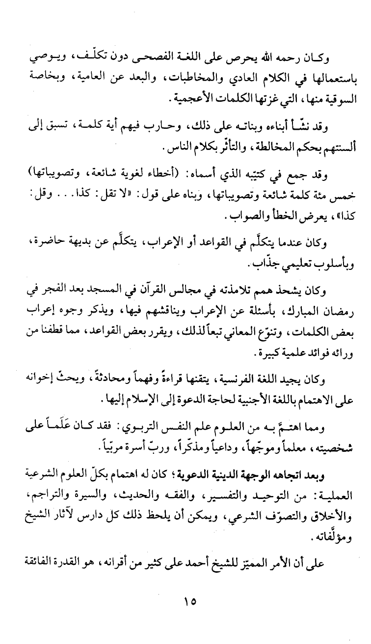 وكان رحمه الله يحرص على اللغة الفصحى دون تكلّف، ويوصي