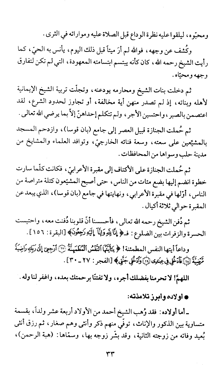 ثم دخلت بنات الشيخ ومحارمه يودعنه، وتجلّت تربية الشيخ الإيمانية