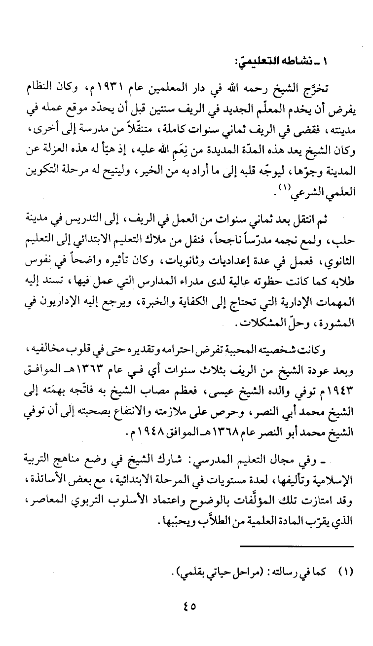 حلب، ولمع نجمه مدرّساً ناجحأ، فنقل من ملاك التعليم الابتدائي إلر! التعليم