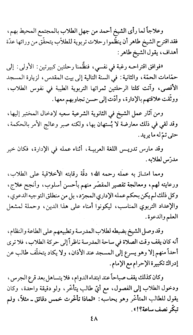 فقد اقترح الشيخ طاهر أن ينطموا رحلات تربوية للطلآب يتحقّق من ورائها عدّة