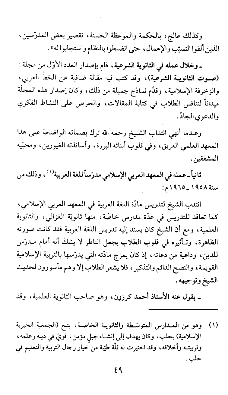 الإسلامية) بحلب، وكان يهدف إلى إنشاء جيلِ مؤمن، صوقي في دينه وعلمه،