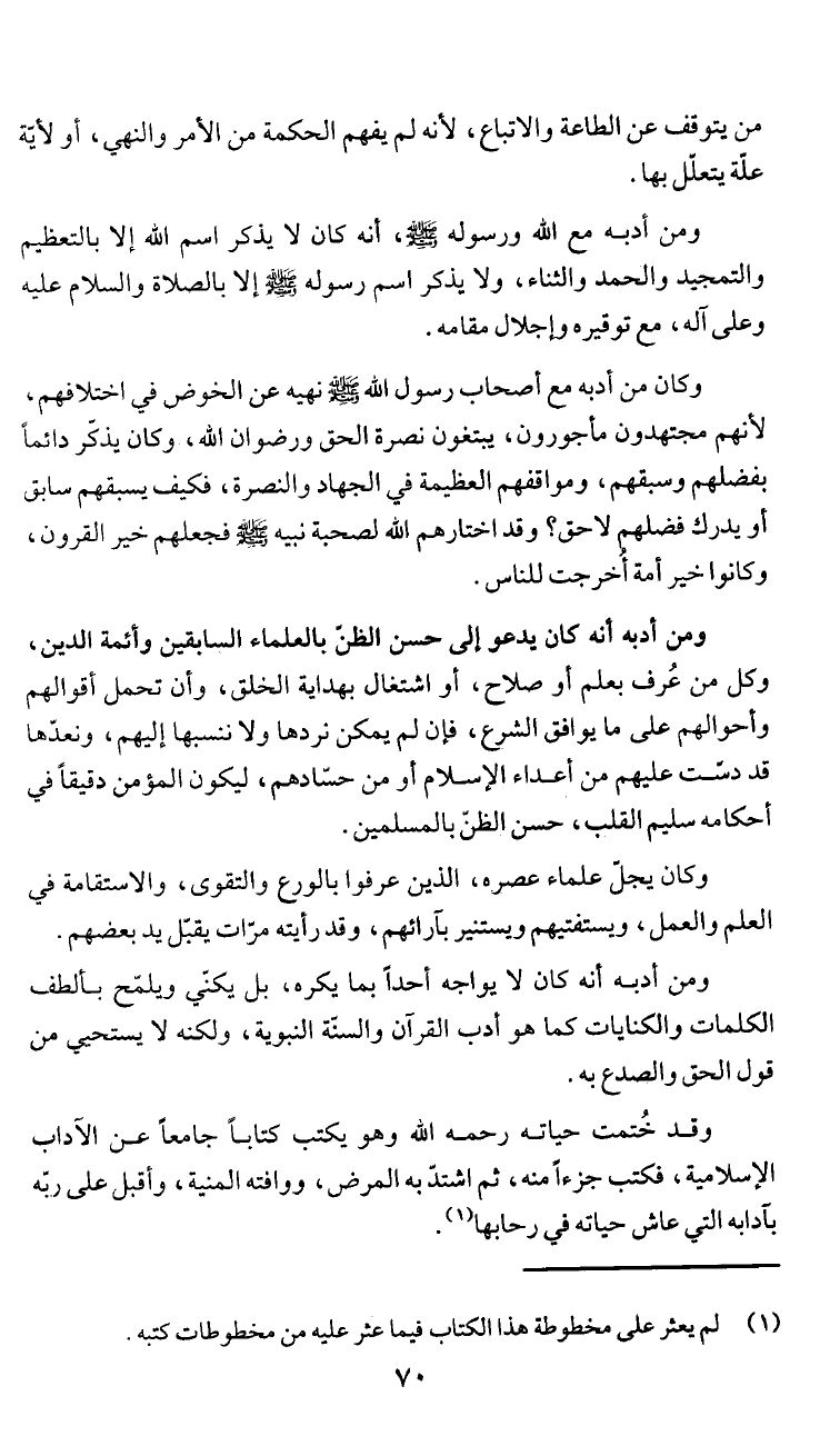 ومن أدبه انه كان يدعو إلى حسن الظن بالعلماء السابقين وأئمة الدين،