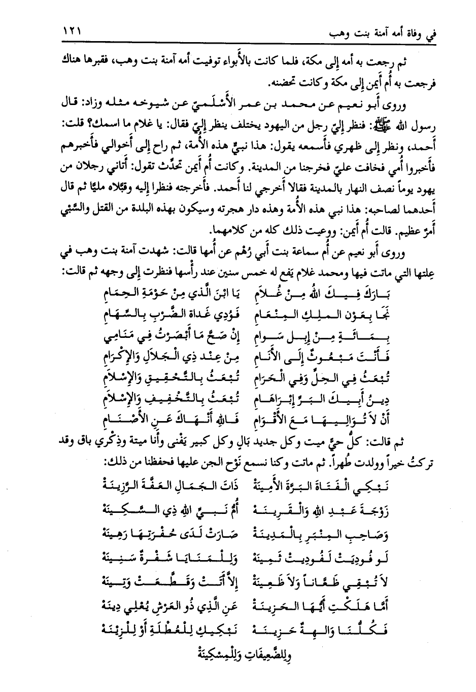 وروى أبو نعيم عن أم سماعة بنت أبي رهم عن أمها قالت: شهدت آمنة بنت وهب في علتها التي ماتت فيها ومحمد غلام يفع له خمس سنين عند رأسها فنظرت إلى وجهه ثم قالت: