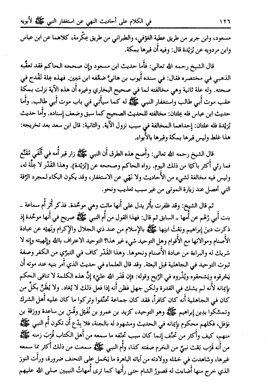 قال الشيخ رحمه اللَّه تعالى: وأصح هذه الطرق أن النبي صلى الله عليه وسلم زار قبر أمه في ألفي مقنع فما رئي أكثر باكيا من ذلك اليوم. رواه الحاكم وصححه عن [بريدة] . وهذا القدر لا علة له، وليس فيه مخالفة لشيء من الأحاديث، ولا نهي عن الاستغفار، وقد يكون البكاء لمجرد الرقة التي تحصل عند زيارة الموتى من غير سبب تعذيب ونحو.