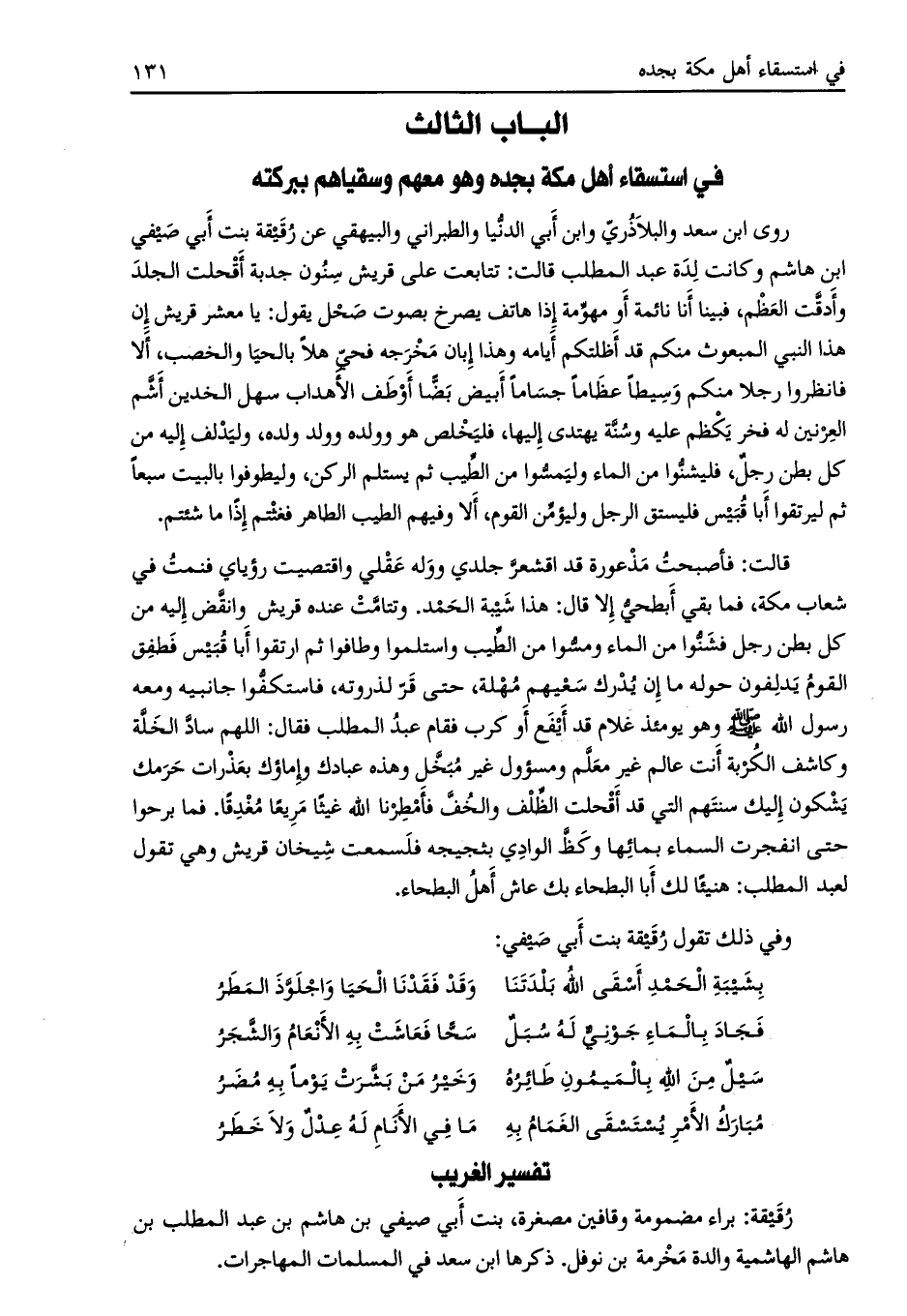 روى ابن سعد والبلاذري وابن أبي الدنيا والطبراني والبيهقي عن رقيقة بنت أبي صيفي ابن هاشم وكانت لدة عبد المطلب قالت: تتابعت على قريش سنون جدبة أقحلت الجلد وأدقت العظم، فبينا أنا نائمة أو مهومة إذا هاتف يصرخ بصوت صحل يقول: يا معشر قريش إن هذا النبي المبعوث منكم قد أظلتكم أيامه وهذا إبان مخرجه فحي هلا بالحيا والخصب، ألا فانظروا رجلا منكم وسيطا عظاما جساما أبيض بضا أوطف الأهداب سهل الخدين أشم العرنين له فخر يكظم عليه وسنة يهتدى إليها، فليخلص هو وولده وولد ولده، وليدلف إليه من كل بطن رجل، فليشنوا من الماء وليمسوا من الطيب ثم يستلم الركن، وليطوفوا بالبيت سبعا ثم ليرتقوا أبا قبيس فليستق الرجل وليؤمن القوم، ألا وفيهم الطيب الطاهر فغثتم إذا ما شئتم.