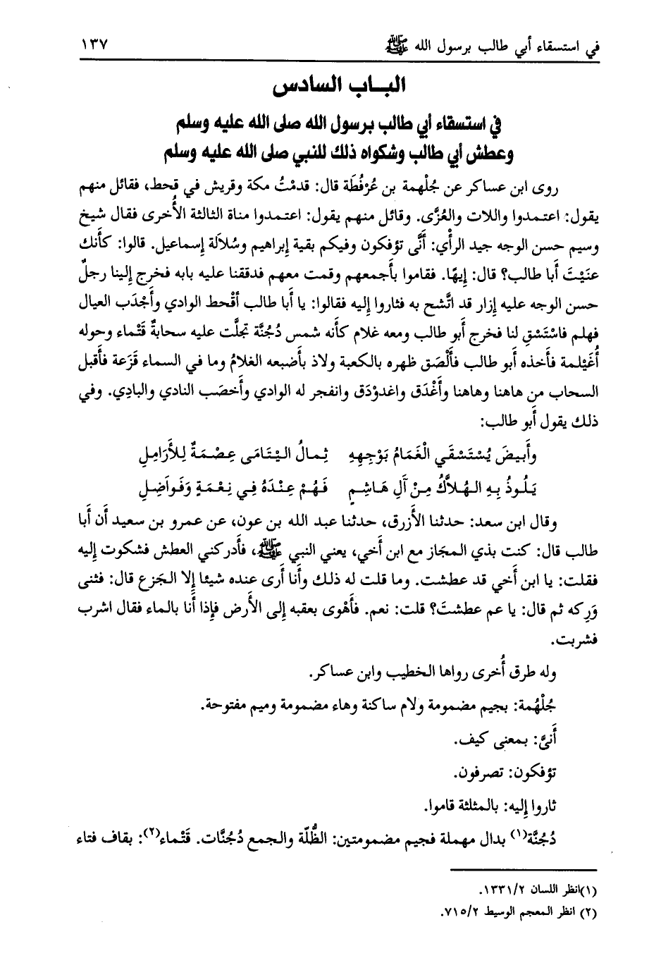 الباب السادس في استسقاء أبي طالب برسول الله صلى الله عليه وسلم وعطش أبي طالب وشكواه ذلك للنبي صلى الله عليه وسلم