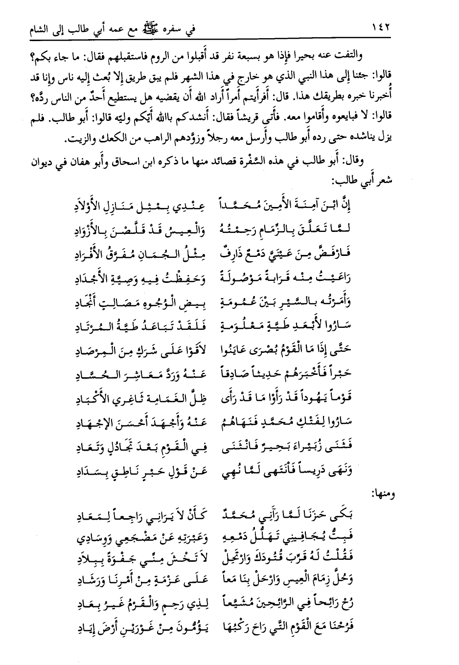 وقال: أبو طالب في هذه السّفرة قصائد منها ما ذكره ابن إسحاق وأبو هفان في ديوان شعر أبي طالب: