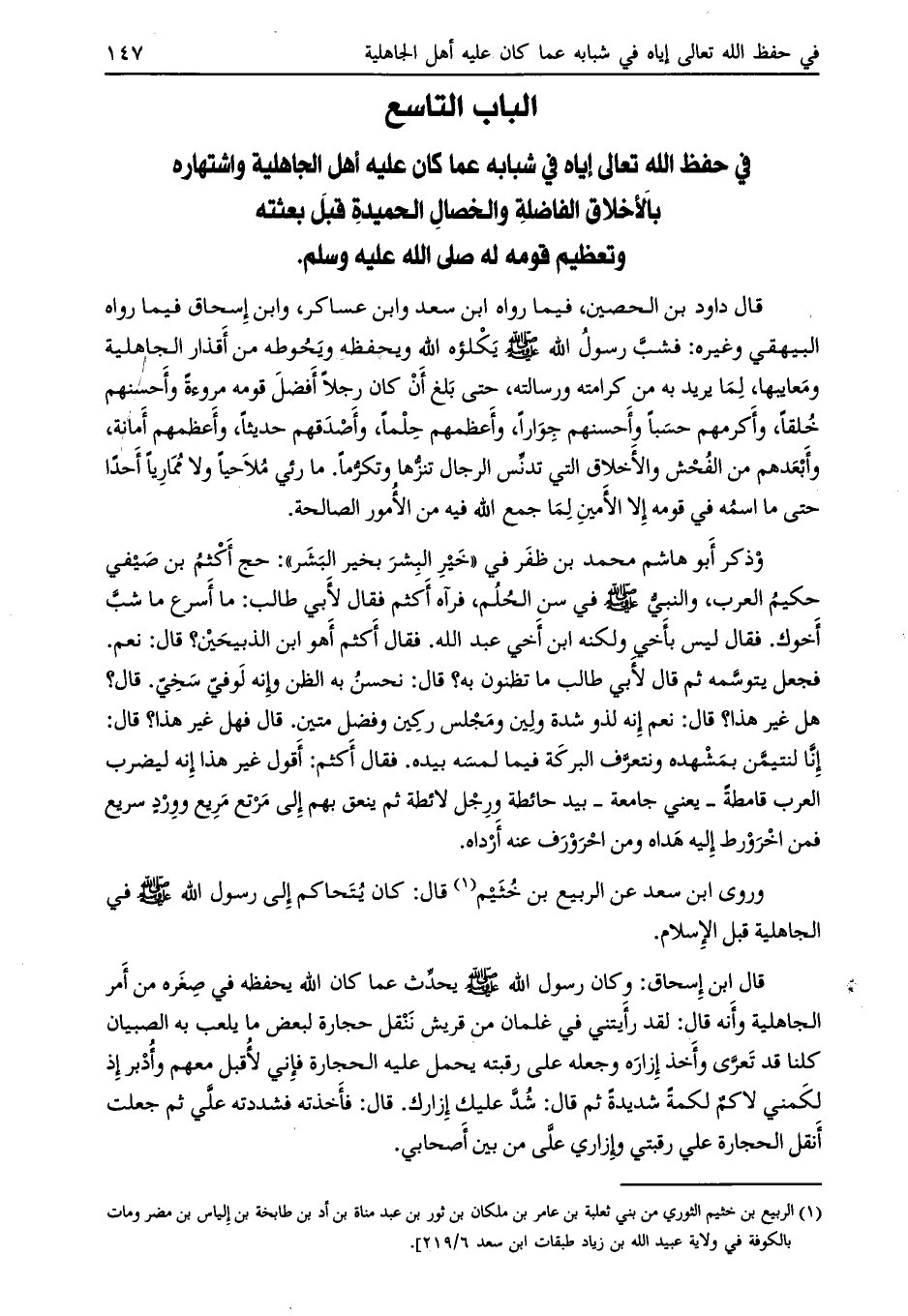 الباب التاسع في حفظ الله تعالى إياه في شبابه عما كان عليه أهل الجاهلية واشتهاره بالأخلاق الفاضلة والخصال الحميدة قبل بعثته وتعظيم قومه له صلى الله عليه وسلم.