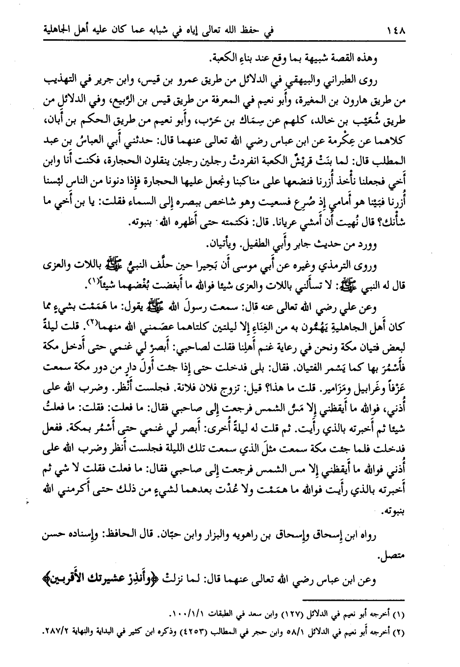 روى الطبراني والبيهقي في الدلائل من طريق عمرو بن قيس، وابن جرير في التهذيب من طريق هارون بن المغيرة، وأبو نعيم في المعرفة من طريق قيس بن الربيع، وفي الدلائل من طريق شعيب بن خالد، كلهم عن سماك بن حرب، وأبو نعيم من طريق الحكم بن أبان، كلاهما عن عكرمة عن ابن عباس رضي اللَّه تعالى عنهما قال: حدثني أبي العباس بن عبد المطلب قال: لما بنت قريش الكعبة انفردت رجلين ينقلون الحجارة، فكنت أنا وابن أخي فجعلنا نأخذ أزرنا فنضعها على مناكبنا ونجعل عليها الحجارة فإذا دنونا من الناس لبسنا أزرنا فبينا هو أمامي إذ صرع فسعيت وهو شاخص ببصره إلى السماء فقلت: يا بن أخي ما شأنك؟ قال نهيت أن أمشي عريانا. قال: فكتمته حتى أظهره اللَّه بنبوته.