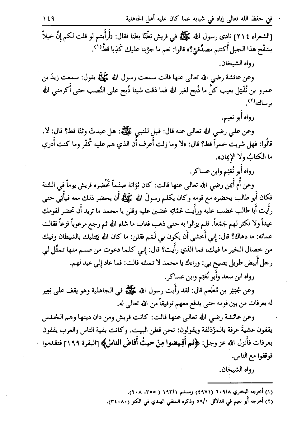وعن عائشة رضي اللَّه تعالى عنها قالت سمعت رسول اللَّه صلى اللَّه عليه وسلم يقول: سمعت زيد بن عمرو بن نفيل يعيب كل ما ذبح لغير اللَّه فما ذقت شيئاً ذبح على النصب حتى أكرمني اللَّه برسالته [ (2) ] .
