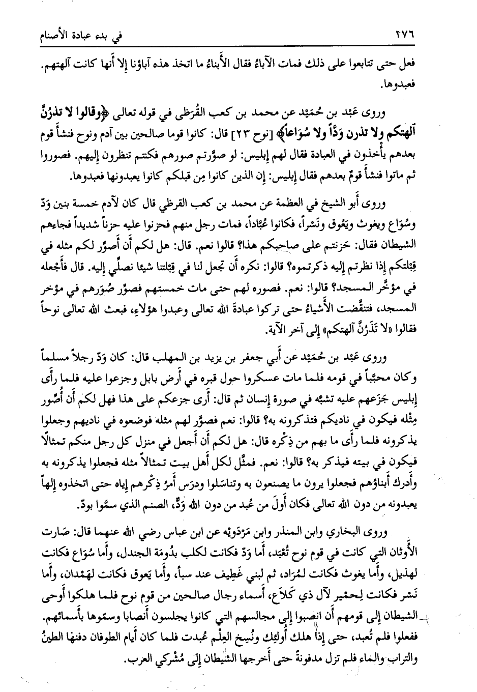 وروى عبد بن حميد عن محمد بن كعب القرظى في قوله تعالى وَقالُوا لا تَذَرُنَّ آلِهَتَكُمْ وَلا تَذَرُنَّ وَدًّا وَلا سُواعاً [نوح 23] قال: كانوا قوما صالحين بين آدم ونوح فنشأ قوم بعدهم يأخذون في العبادة فقال لهم إبليس: لو صوّرتهم صورهم فكنتم تنظرون إليهم. فصوروا ثم ماتوا فنشأ قوم بعدهم فقال إبليس: إن الذين كانوا من قبلكم كانوا يعبدونها فعبدوها.