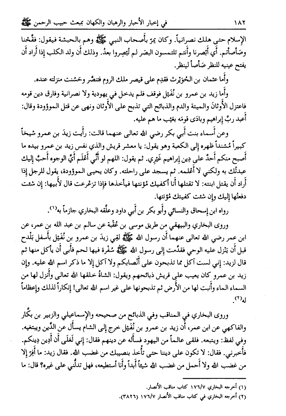 وروى البخاري والبيهقي من طريق موسى بن عقبة عن سالم بن عبد الله بن عمر، عن ابن عمر رضي اللَّه تعالى عنهما أن رسول اللَّه صلى الله عليه وسلم لقى زيد بن عمرو بن نفيل بأسفل بلدح قبل أن ينزل عليه الوحي فقدمت إلى رسول اللَّه صلى الله عليه وسلم سفرة فيها لحم فأبى أن يأكل منها ثم قال لزيد: إني لست آكل مما تذبحون على أنصابكم ولا آكل إلا ما ذكر اسم اللَّه عليه. وإن زيد بن عمرو كان يعيب على قريش ذبائحهم ويقول: الشاة خلقها اللَّه تعالى وأنزل لها من السماء الماء وأنبت لها من الأرض ثم تذبحونها على غير اسم اللَّه تعالى! إنكارا لذلك وإعظاما له [ (2) ] .