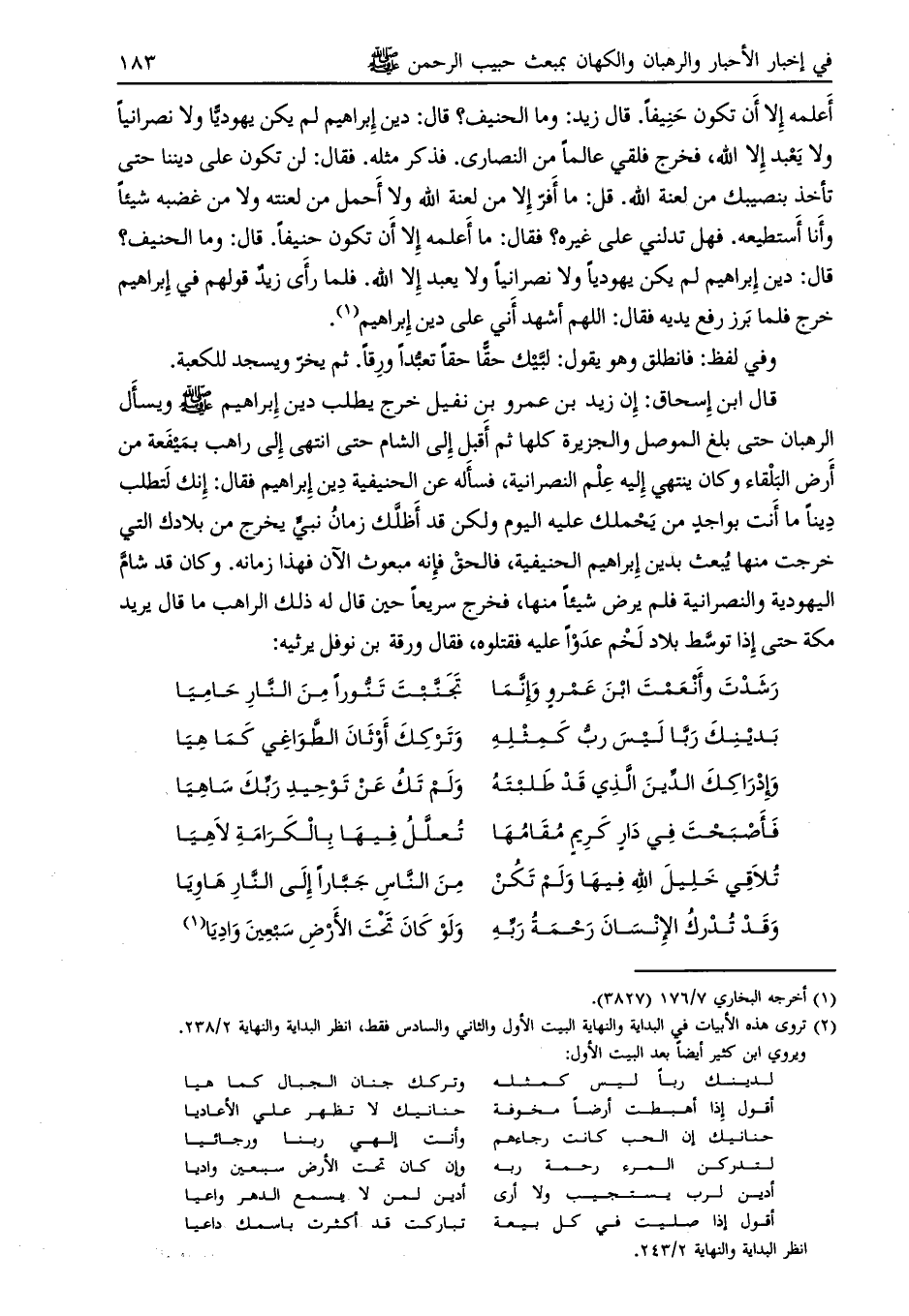 أعلمه إلا أن تكون حنيفا. قال زيد: وما الحنيف؟ قال: دين إبراهيم لم يكن يهوديا ولا نصرانيا ولا يعبد إلا اللَّه، فخرج فلقي عالما من النصارى. فذكر مثله. فقال: لن تكون على ديننا حتى تأخذ بنصيبك من لعنة اللَّه. قل: ما أفر إلا من لعنة اللَّه ولا أحمل من لعنته ولا من غضبه شيئاً وأنا أستطيعه. فهل تدلني على غيره؟ فقال: ما أعلمه إلا أن تكون حنيفا. قال: وما الحنيف؟
