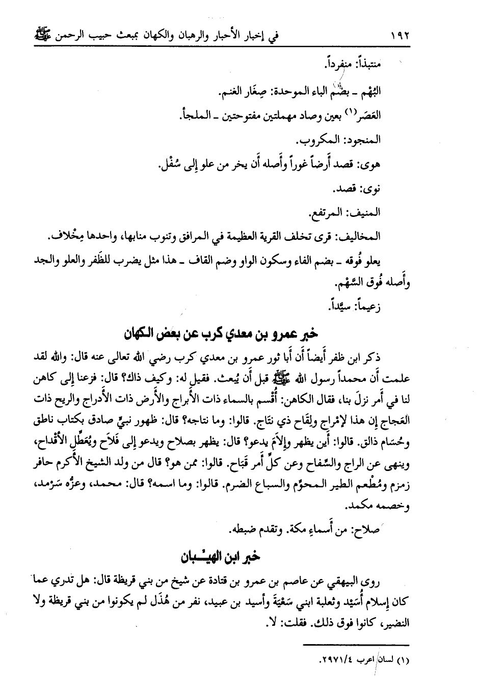 ذكر ابن ظفر أيضاً أن أبا ثور عمرو بن معدي كرب رضي اللَّه تعالى عنه قال: واللَّه لقد علمت أن محمدا رسول اللَّه صلى الله عليه وسلم قبل أن يبعث. فقيل له: وكيف ذاك؟ قال: فزعنا إلى كاهن لنا في أمر نزل بنا، فقال الكاهن: أقسم بالسماء ذات الأبراج والأرض ذات الأدراج والريح ذات العجاج إن هذا لإمراج ولقاح ذي نتاج. قالوا: وما نتاجه؟ قال: ظهور نبي صادق بكتاب ناطق وحسام ذالق. قالوا: أين يظهر وإلام يدعو؟ قال: يظهر بصلاح ويدعو إلى فلاح ويعطل الأقداح، وينهى عن الراج والسفاح وعن كل أمر قباح. قالوا: ممن هو؟ قال من ولد الشيخ الأكرم حافر زمزم ومطعم الطير المحرّم والسباع الضرم. قالوا: وما اسمه؟ قال: محمد، وعزه سرمد، وخصمه مكمد.