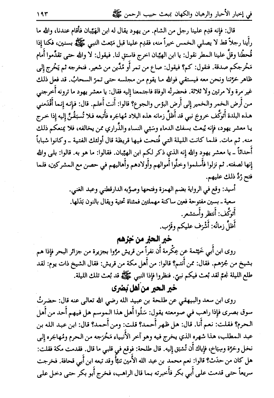 هل كان من حدث؟ قالوا: نعم محمد بن عبد الله الأمين تنبأ وقد تبعه ابن أبي قحافة. فخرجت سريعا حتى قدمت على أبي بكر فأخبرته بما قال الراهب، فخرج أبو بكر حتى دخل على
