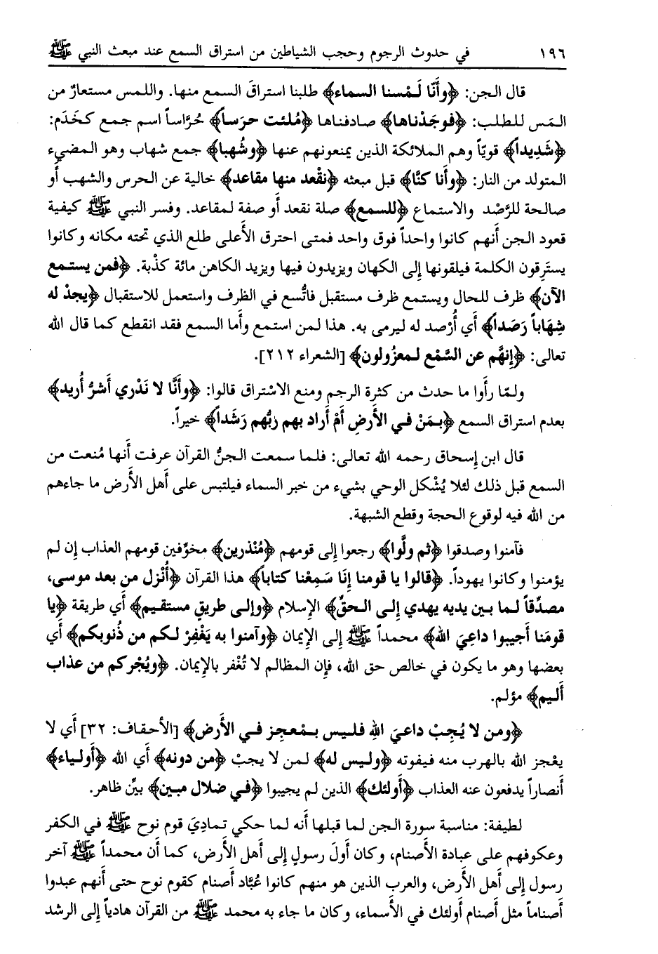 قال ابن إسحاق رحمه اللَّه تعالى: فلما سمعت الجن القرآن عرفت أنها منعت من السمع قبل ذلك لئلا يشكل الوحي بشيء من خبر السماء فيلتبس على أهل الأرض ما جاءهم من اللَّه فيه لوقوع الحجة وقطع الشبهة.