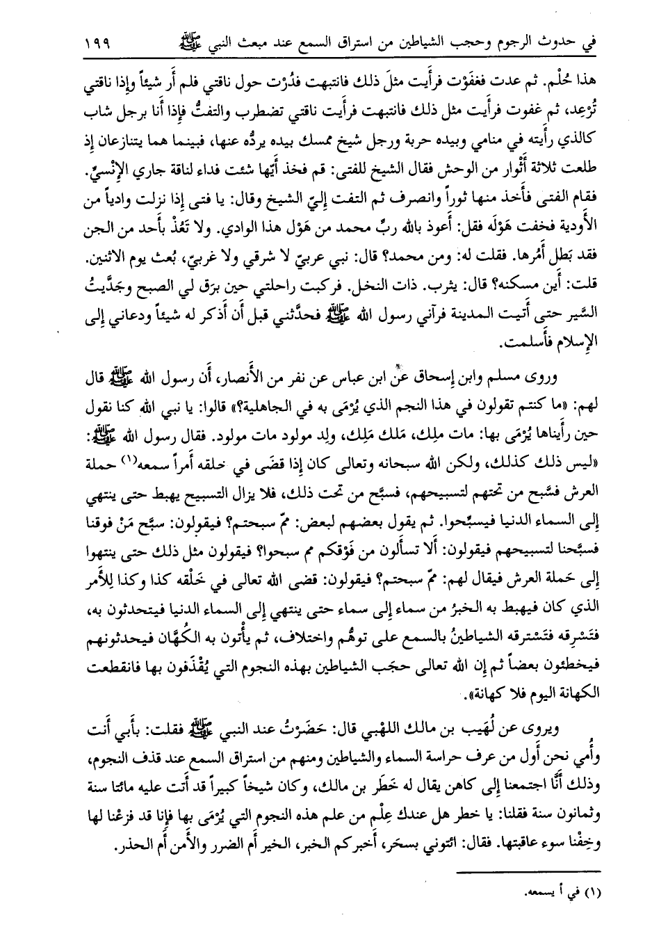 وروى مسلم وابن إسحاق عن ابن عباس عن نفر من الأنصار، أن رسول اللَّه صلى الله عليه وسلم قال لهم: «ما كنتم تقولون في هذا النجم الذي يرمى به في الجاهلية؟» قالوا: يا نبي اللَّه كنا نقول حين رأيناها يرمى بها: مات ملك، ملك ملك، ولد مولود مات مولود. فقال رسول اللَّه صلى الله عليه وسلم: