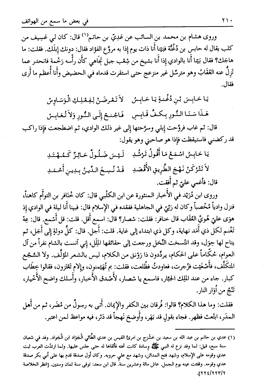 وروى هشام بن محمد بن السائب عن عدي بن حاتم [ (1) ] قال: كان لي عسيف من كلب يقال له حابس بن دغنة فبينا أنا ذات يوم إذا به مروع الفؤاد فقال: دونك إبلك. فقلت: ما هاجك؟ فقال بينا أنا بالوادي إذا أنا بشيخ من شعب جبل تجاهي كأن رأسه رخمة فانحدر عما تزل عنه العقاب وهو مترسل غير منزعج حتى استقرت قدماه في الحضيض وأنا أعظم ما أرى فقال.