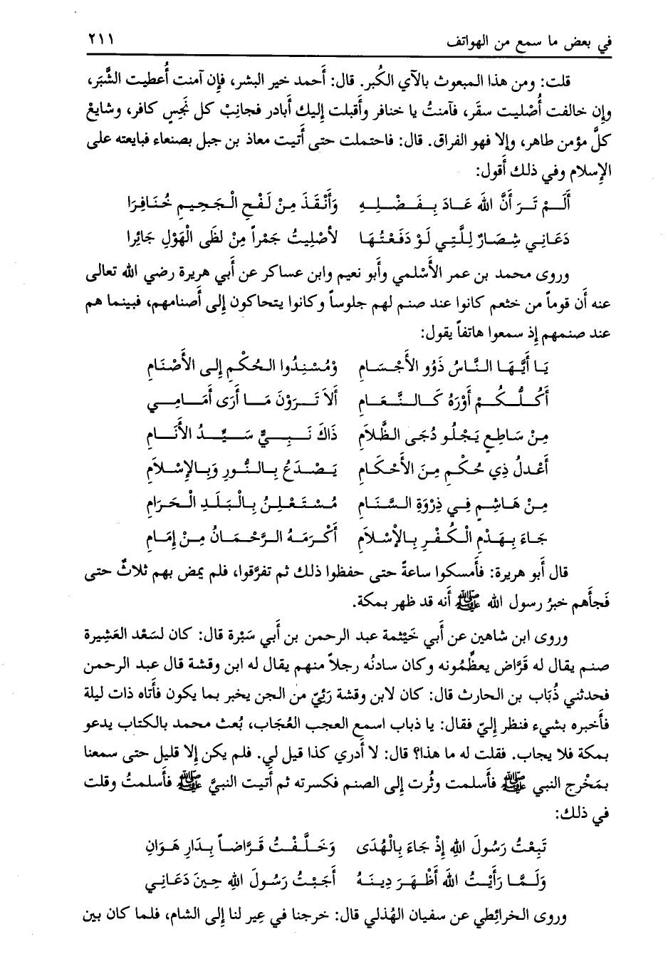 قلت: ومن هذا المبعوث بالآي الكبر. قال: أحمد خير البشر، فإن آمنت أعطيت الشبر، وإن خالفت أصليت سقر، فآمنت يا خنافر وأقبلت إليك أبادر فجانب كل نجس كافر، وشايع كل مؤمن طاهر، وإلا فهو الفراق. قال: فاحتملت حتى أتيت معاذ بن جبل بصنعاء فبايعته على الإسلام وفى ذلك أقول: