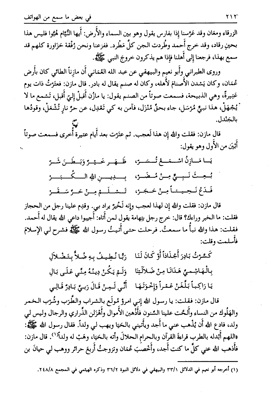 وروى الطبراني وأبو نعيم والبيهقي عن عبد الله العماني أن مازنا الطائي كان بأرض عمان، وكان يسدن الأصنام لأهله، وكان له صنم يقال له بادر. قال مازن: فعترت ذات يوم عتيرة، وهي الذبيحة، فسمعت صوتا من الصنم يقول: يا مازن أقبل إلي أقبل، تسمع ما لا يجهل، هذا نبي مرسل، جاء بحق منزل، فآمن به كي تعدل، عن حر نار تشعل، وقودها بالجندل.
