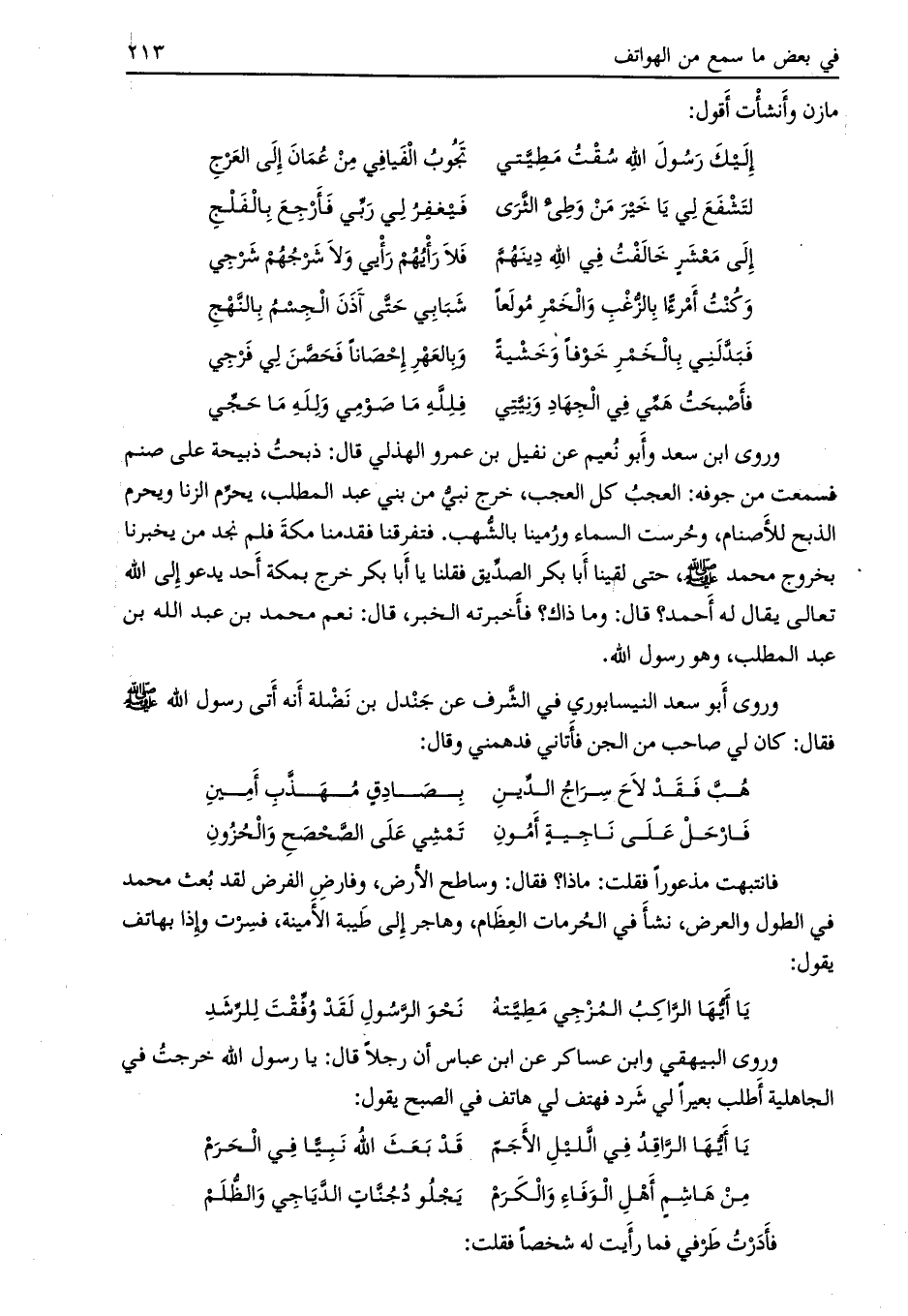 وروى البيهقي وابن عساكر عن ابن عباس أن رجلا قال: يا رسول اللَّه خرجت في الجاهلية أطلب بعيرا لي شرد فهتف لي هاتف في الصبح يقول: