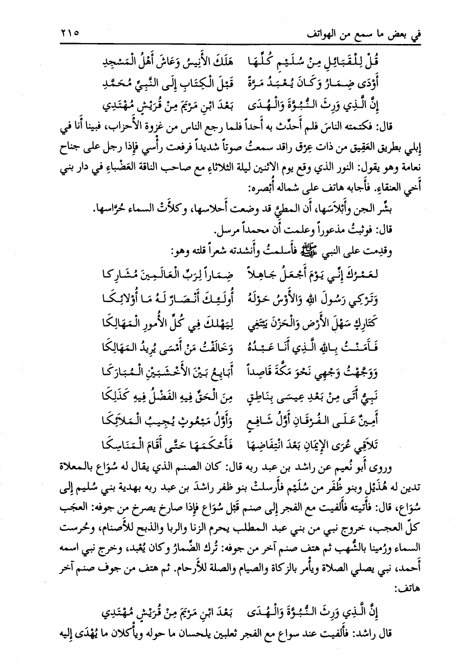 وروى أبو نعيم عن راشد بن عبد ربه قال: كان الصنم الذي يقال له سواع بالمعلاة تدين له هذيل وبنو ظفر من سليم فأرسلت بنو ظفر راشد بن عبد ربه بهدية بني سليم إلى سواع، قال: فأتيته فألفيت مع الفجر إلى صنم قبل سواع فإذا صارخ يصرخ من جوفه: العجب كل العجب، خروج نبي من بني عبد المطلب يحرم الزنا والربا والذبح للأصنام، وحرست السماء ورمينا بالشهب ثم هتف صنم آخر من جوفه: ترك الضمار وكان يعبد، وخرج نبي اسمه أحمد، نبي يصلي الصلاة ويأمر بالزكاة والصيام والصلة للأرحام. ثم هتف من جوف صنم آخر هاتف: