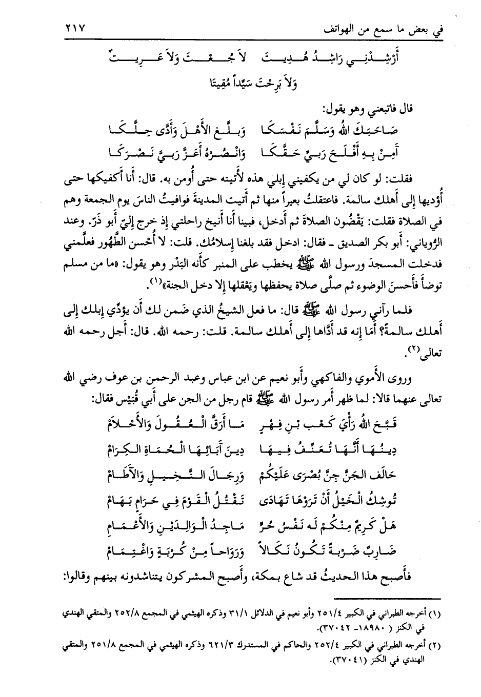 وروى الأموي والفاكهي وأبو نعيم عن ابن عباس وعبد الرحمن بن عوف رضي اللَّه تعالى عنهما قالا: لما ظهر أمر رسول اللَّه صلى الله عليه وسلم قام رجل من الجن على أبي قبيس فقال: