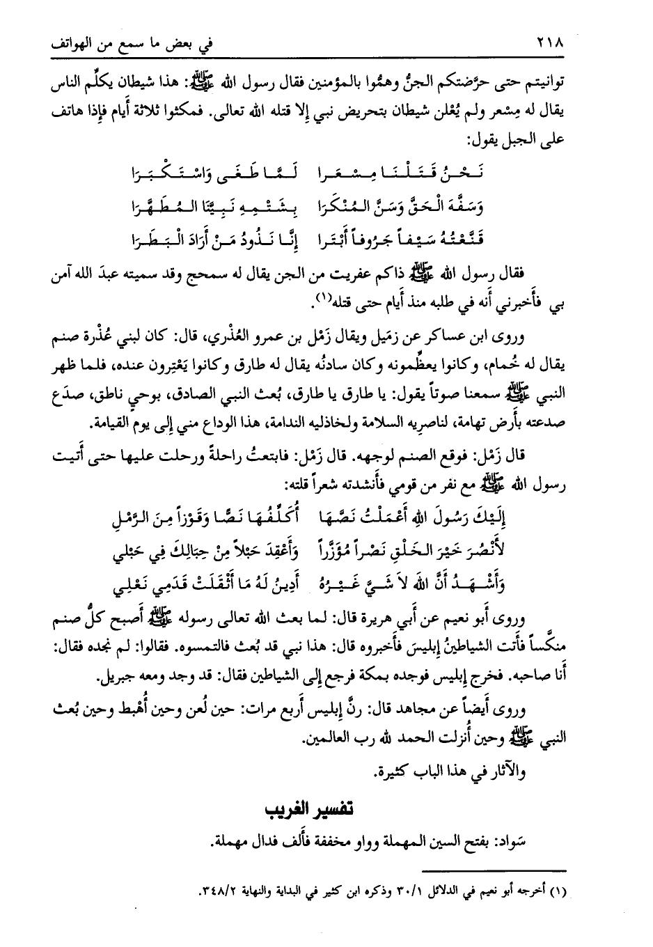 نحن قتلنا مسعرا* لما طغى واستكبرا وسفه الحق وسن المنكرا* بشتمه نبينا المطهرا قنعته سيفا جروفا أبترا* إنا نذود من أراد البطرا فقال رسول اللَّه صلى الله عليه وسلم ذاكم عفريت من الجن يقال له سمحج وقد سميته عبد الله آمن بي فأخبرني أنه في طلبه منذ أيام حتى قتله [ (1) ] .