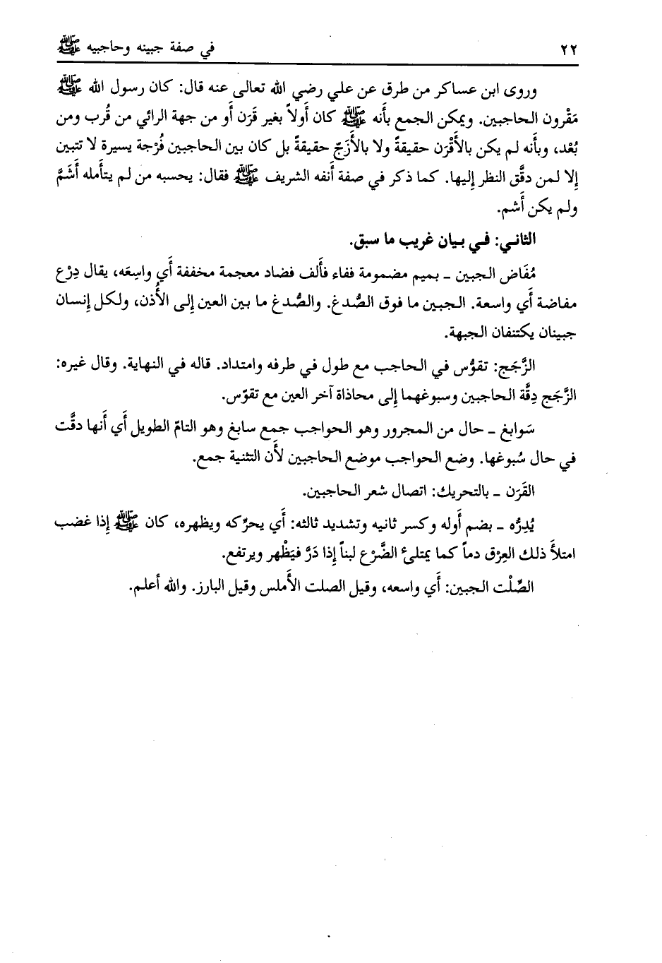 وروى ابن عساكر من طرق عن علي رضي اللَّه تعالى عنه قال: كان رسول اللَّه صلى الله عليه وسلم مقرون الحاجبين.