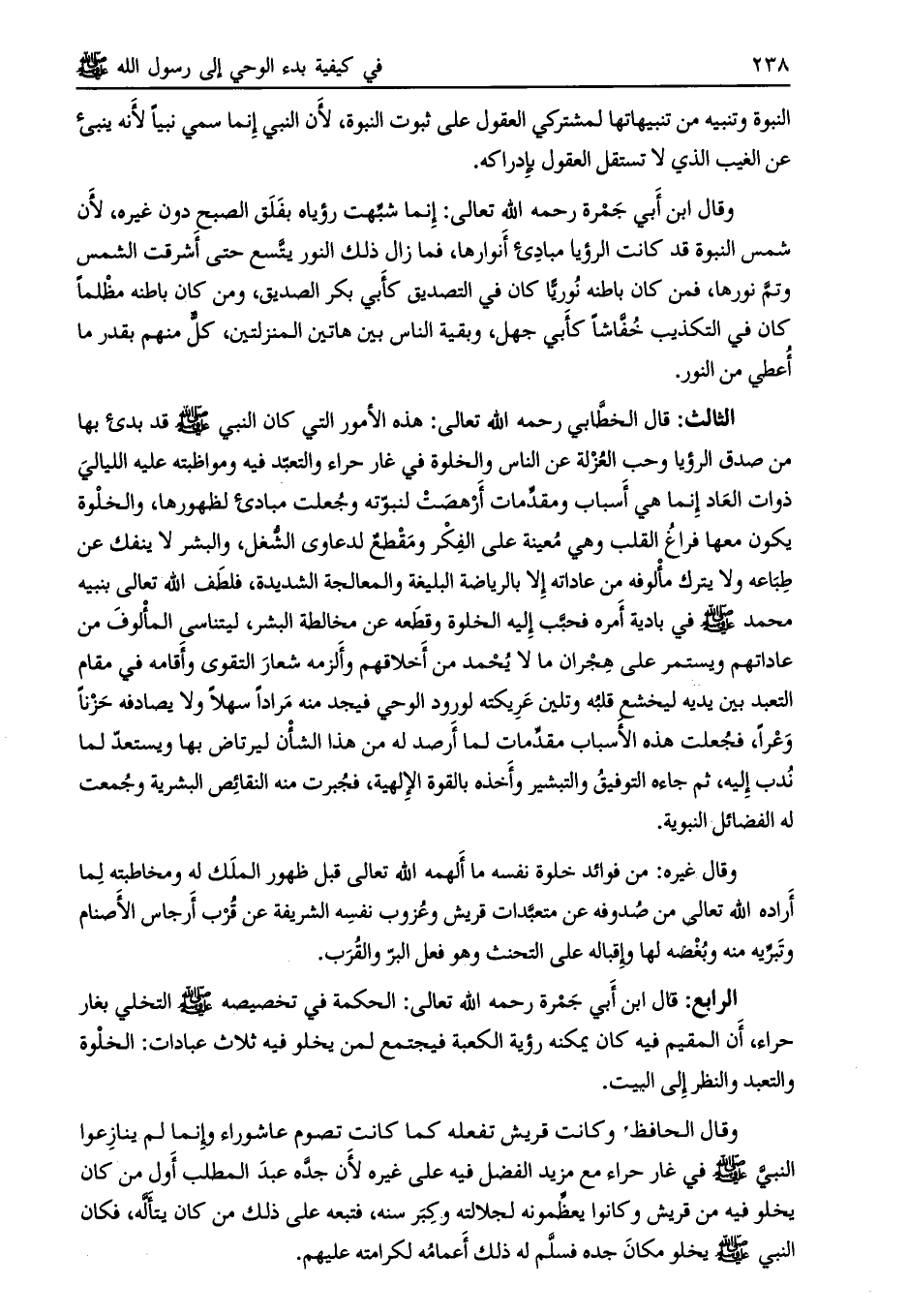 الثالث: قال الخطابي رحمه اللَّه تعالى: هذه الأمور التي كان النبي صلى الله عليه وسلم قد بدئ بها من صدق الرؤيا وحب العزلة عن الناس والخلوة في غار حراء والتعبد فيه ومواظبته عليه الليالي ذوات العاد إنما هي أسباب ومقدمات أرهصت لنبوته وجعلت مبادئ لظهورها، والخلوة يكون معها فراغ القلب وهي معينة على الفكر ومقطع لدعاوى الشغل، والبشر لا ينفك عن طباعه ولا يترك مألوفه من عاداته إلا بالرياضة البليغة والمعالجة الشديدة، فلطف اللَّه تعالى بينه محمد صلى الله عليه وسلم في بادية أمره فحبب إليه الخلوة وقطعه عن مخالطة البشر، ليتناسى المألوف من عاداتهم ويستمر على هجران ما لا يحمد من أخلاقهم وألزمه شعار التقوى وأقامه في مقام التعبد بين يديه ليخشع قلبه وتلين عريكته لورود الوحي فيجد منه مرادا سهلا ولا يصادفه حزنا وعرا، فجعلت هذه الأسباب مقدمات لما أرصد له من هذا الشأن ليرتاض بها ويستعد لما ندب إليه، ثم جاءه التوفيق والتبشير وأخذه بالقوة الإلهية، فجبرت منه النقائص البشرية وجمعت له الفضائل النبوية.