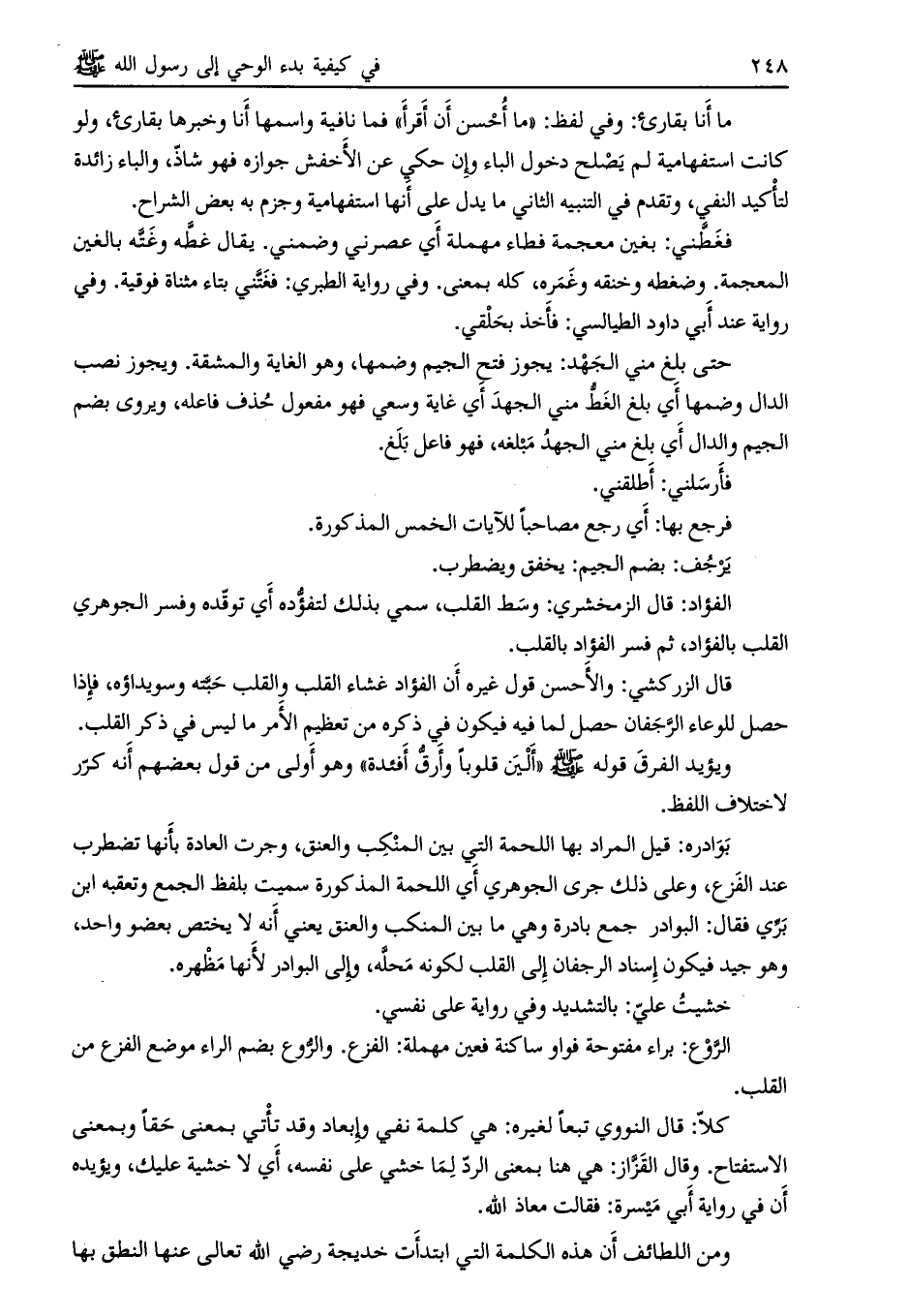 بوادره: قيل المراد بها اللحمة التي بين المنكب والعنق، وجرت العادة بأنها تضطرب عند الفزع، وعلى ذلك جرى الجوهري أي اللحمة المذكورة سميت بلفظ الجمع وتعقبه ابن بري فقال: البوادر جمع بادرة وهي ما بين المنكب والعنق يعني أنه لا يختص بعضو واحد، وهو جيد فيكون إسناد الرجفان إلى القلب لكونه محله، وإلى البوادر لأنها مظهره.