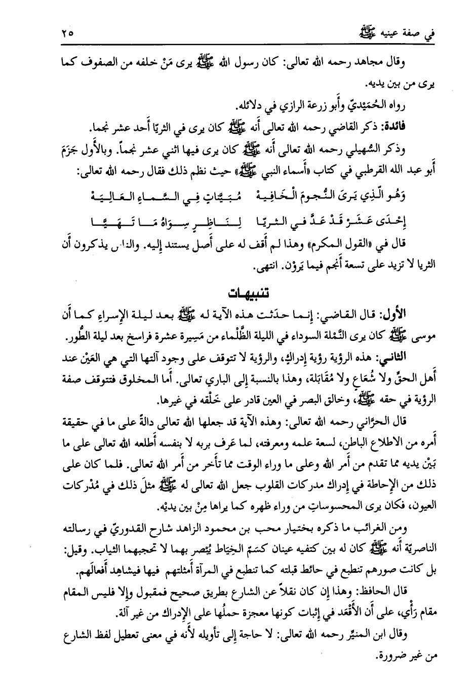 الثاني: هذه الرؤية رؤية إدراك، والرؤية لا تتوقف على وجود آلتها التي هي العين عند أهل الحق ولا شعاع ولا مقابلة، وهذا بالنسبة إلى الباري تعالى. أما المخلوق فتتوقف صفة الرؤية في حقه صلى الله عليه وسلم، وخالق البصر في العين قادر على خلقه في غيرها.